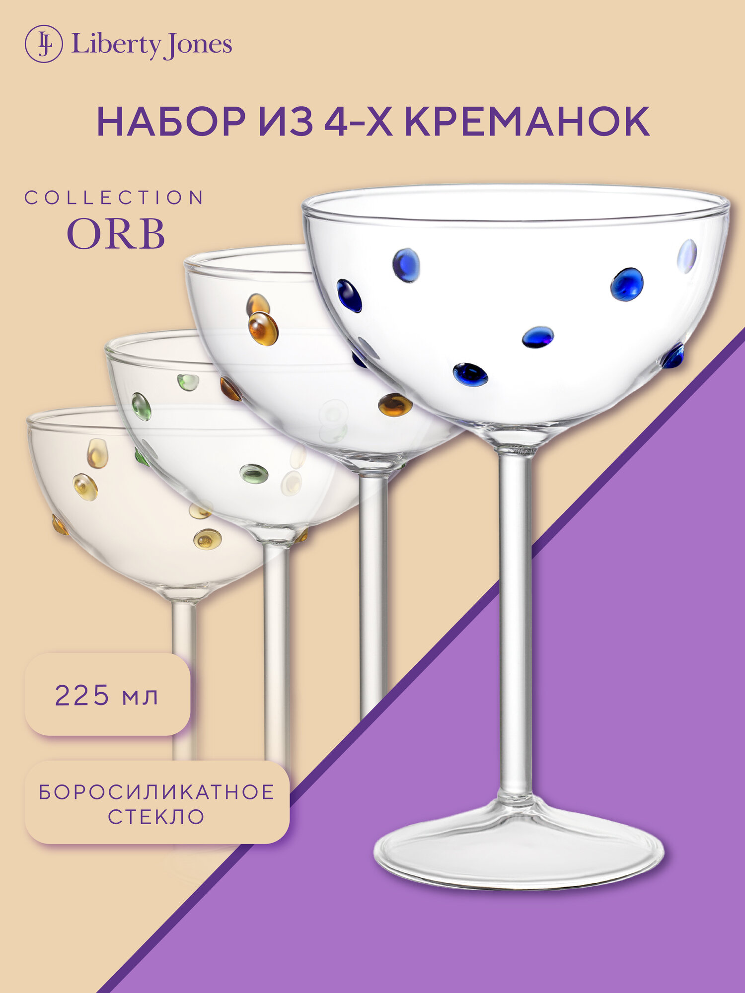 Материал: боросиликатное стекло. Диаметр верха: 10,1 см. Диаметр основания: 7,1 см. Высота: 16,2 см. Высота ножки: 8,5 см. Вес: 385 г. Толщина стенки: 0,2 см. Объем: 225 мл. Цвет: разноцветный. Количество креманок в наборе: 4 шт.