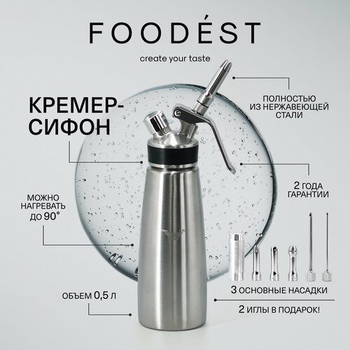 Кулинарный кремер-сифон FoodEST из нержавеющей стали объемом 0,5 л создан как для профессионального, так и домашнего использования. В комплектацию входит сам кремер-сифон, 3 насадки для декорирования (полностью из нержавеющей стали), держатель баллончиков, ершик для очистки ниппеля и 2 иглы в подарок.