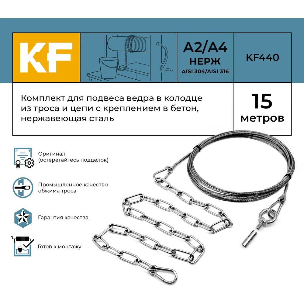 KREPFIELD Комплект для подвеса ведра в колодце из троса и цепи с креплением в бетон, нержавеющая сталь, 15 метров KF440-15: сравнение цен, характеристики, фото, актуальное наличие и цены.