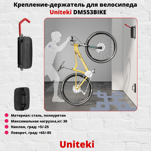 UNITEKI DM553BIKE - решение для хранения велосипедов и самокатов, которое можно разместить в квартирах, домах, гаражах и сараях. Он совместим со всеми типами велосипедов: шоссейными, гибридными, горными, спортивными, MTB, BMX и самокатами, НЕ с цельнометаллическими колесами. Настенный DM553BIKE держатель можно использовать, как крепление взрослых, так и детских велосипедов, как электросамокатов, так и обычных. На нем можно разместить большинство моделей велосипедов и самокатов весом до 30 кг. Удобная, подвесная и поворотная модификация крепления, позволит быстро и компактно разместить велосипеды и самокаты вдоль стены. Надежная конструкция кронштейна - это фиксирующий крюк с резиновым покрытием, такое покрытие мягко и надежно фиксирует колесо и не будет повреждать или царапать ваш велосипед или самокат. Основа настенных упоров имеет тиснение, которое препятствует скольжению колес велосипеда или самоката, это актуально в случае мокрых шин и создаст дополнительную фиксацию. Наличие двух таких платформ обеспечит защиту стены от загрязнений колесами. UNITEKI DM553BIKE поможет освободить пространство на полу, сделать ваш гараж или внутреннее пространство аккуратным и свободным от беспорядка. Подвешивайте любимое транспортное средство и снимайте его со стены одним движением руки.