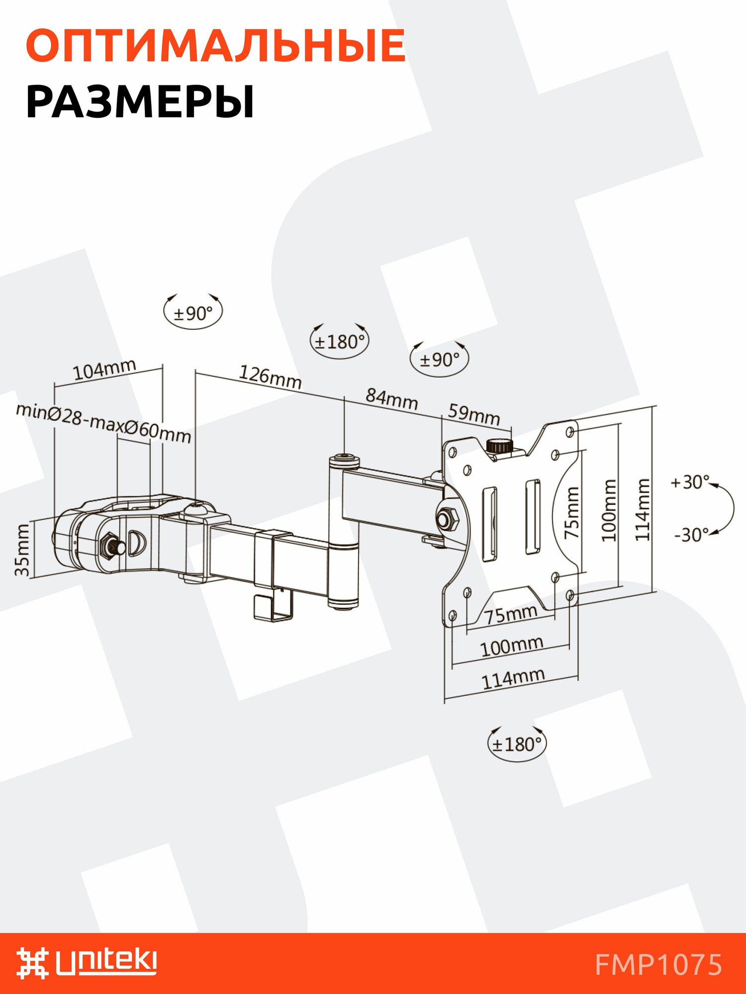 Представляем наклонно-поворотный кронштейн с возможностью крепления к трубе диаметром от 28 до 60 мм. UNITEKI FMP1075 в черном эксклюзивном цвете, который отвечает высочайшим стандартам качества.