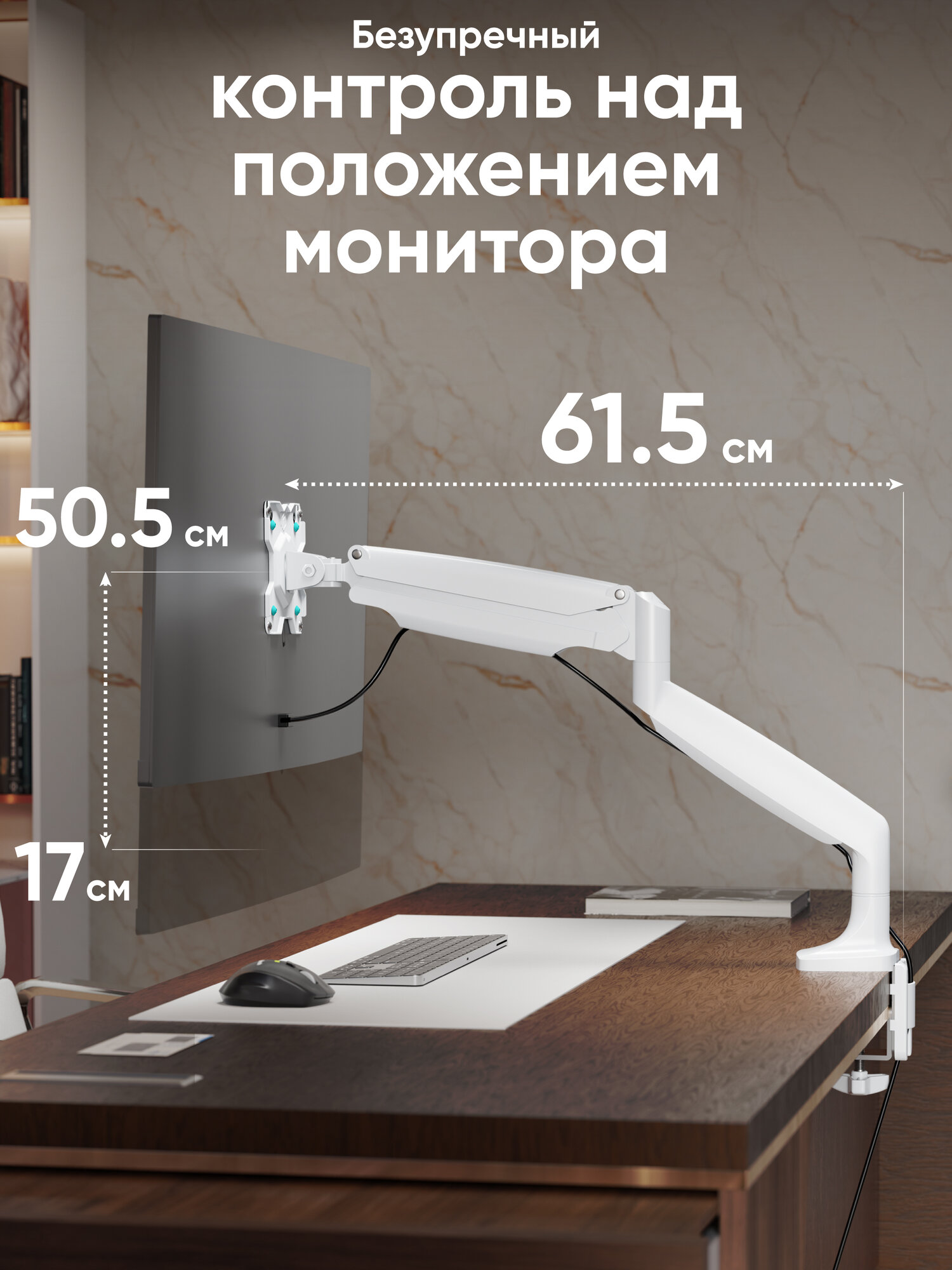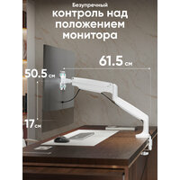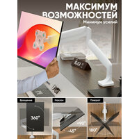 Эргономичный дизайн: данное крепление для монитора на стол оснащено надежной газовой пружиной, обеспечивающей максимальную плавность и точность регулировки экрана. Корпус кронштейна настольного для монитора изготовлен из алюминия, струбцина – из стали, а кабель-канал – из пластика. Благодаря системе кабель-менеджмента все провода будут скрыты, сохраняя порядок на столе и придавая рабочему месту аккуратный внешний вид. В комплекте также идут мягкие эластичные вставки для защиты задней стенки монитора от механических повреждений.