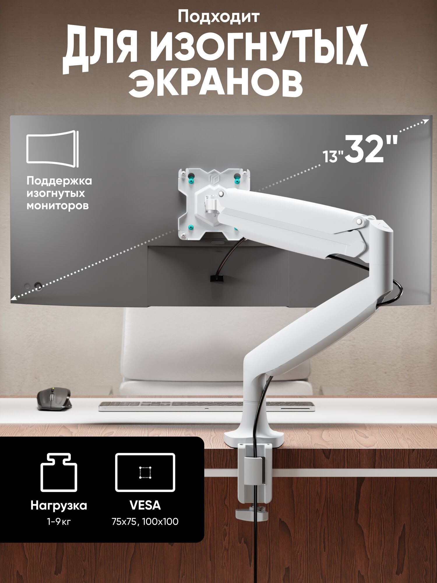 Настольный кронштейн для монитора с газлифтом ONKRON G100 предназначен для плоских и изогнутых экранов с диагональю от 13 до 32 дюймов. Крепление надежно выдержит мониторы весом от 1 до 9 кг. Этот универсальный кронштейн для монитора на стол поддерживает стандарты VESA 75x75, 100x100 и совместим с большинством современных моделей экранов.