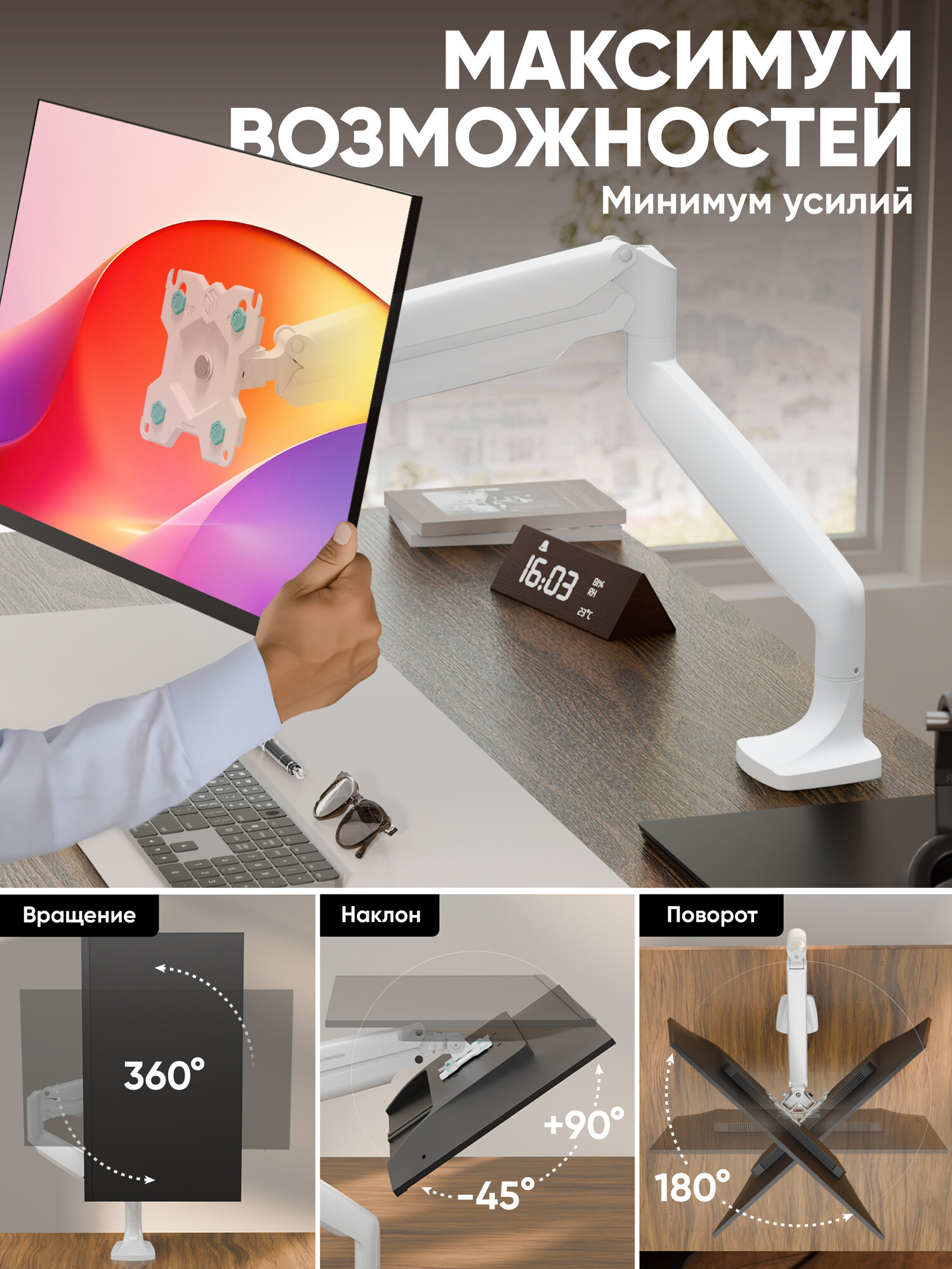 Установка и комплектация: вы можете установить держатель монитора на стол двумя способами: на край столешницы с помощью струбцины или через отверстие в столе. Выберите то, что больше подходит вам для максимально эффективного использования пространства. Комплектация подставки под монитор включает в себя подробную инструкцию на русском языке и набор креплений для большинства популярных брендов, таких как Acer, AOC, Asus, BenQ, Dell, HP, Huawei, Hartens, Hisense, Samsung, Xiaomi, JVC, Lime, Lenovo, LG, Digma, Panasonic, Philips, Razer, SANC, Sharp, Sony, TCL, ViewSonic, Rombica и многих других. Это позволяет легко и быстро установить настольное крепление для монитора без необходимости приобретать дополнительные крепежные элементы.