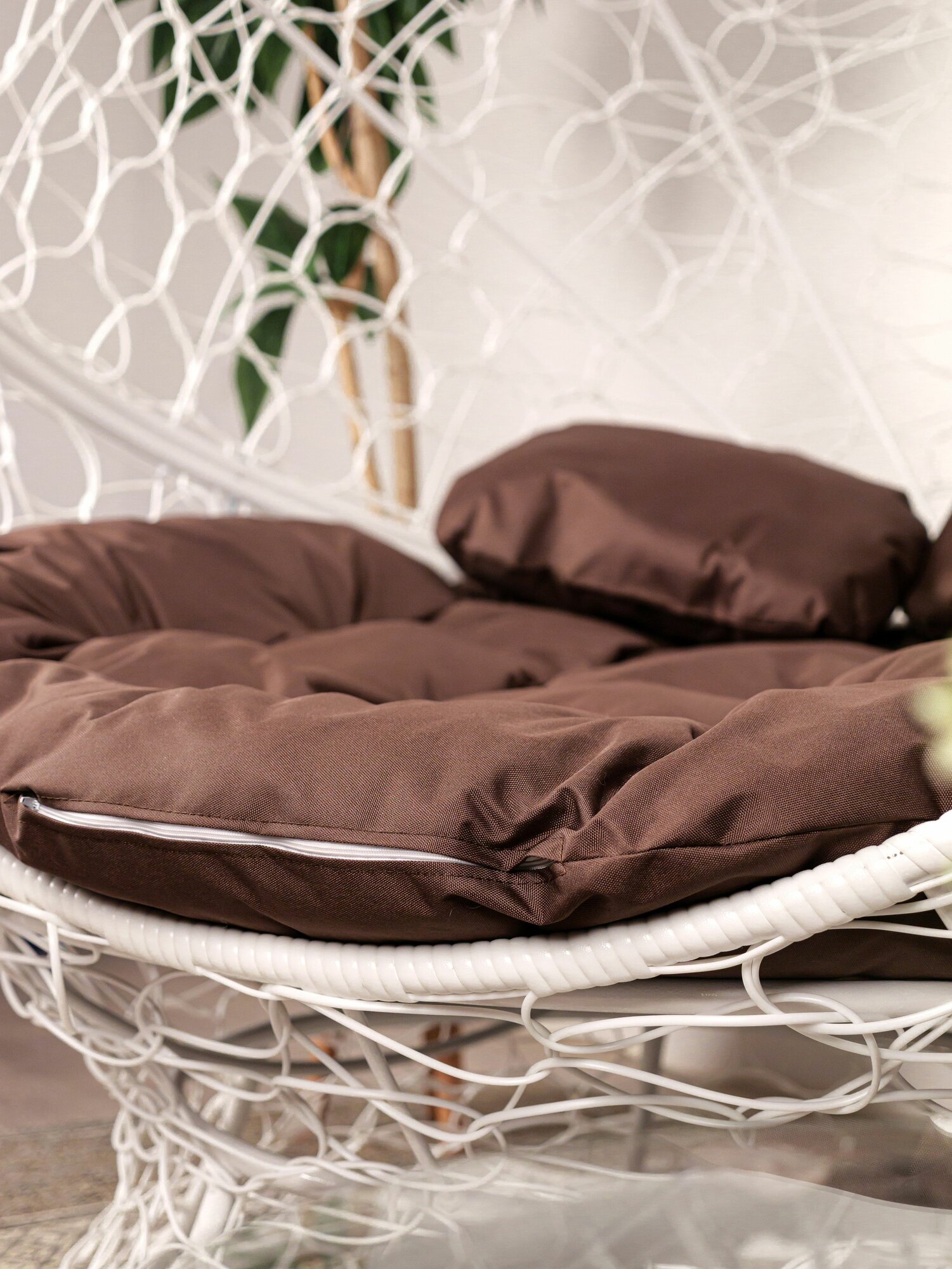 В комплект входит: 1) Разборной каркас. Конструкция выдерживает максимальную нагрузку до 160 кг. Высота в собранном виде - 154 см. 2) Кокон оплетается вручную экоротангом собственного производства. 3) Материал чехла подушки – Оксфорд 600D PU (влагоотталкивающая ткань с пылеотталкивающим эффектом). Уход за подушкой не вызовет у Вас сложностей.
