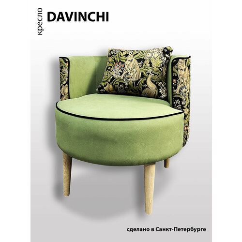 Это компактное кресло круглой формы станет ярким акцентом в вашем интерьере. Идеальное сочетание красочного гобелена, нежного однотонного велюра и декоративного канта. Модель Davinchi отлично подойдет для небольшой гостиной, холла, а так же для балкона или кухни. Каркас выполнен из березовой фанеры, что делает кресло прочным и экологичным, что позволяет использовать кресло даже детских комнатах. В комплекте к креслу идет декоративная подушка с молнией. Устойчивые конусные ножки из бука высотой 25см. Фетровые накладки защитят пол от царапин при перемещении.