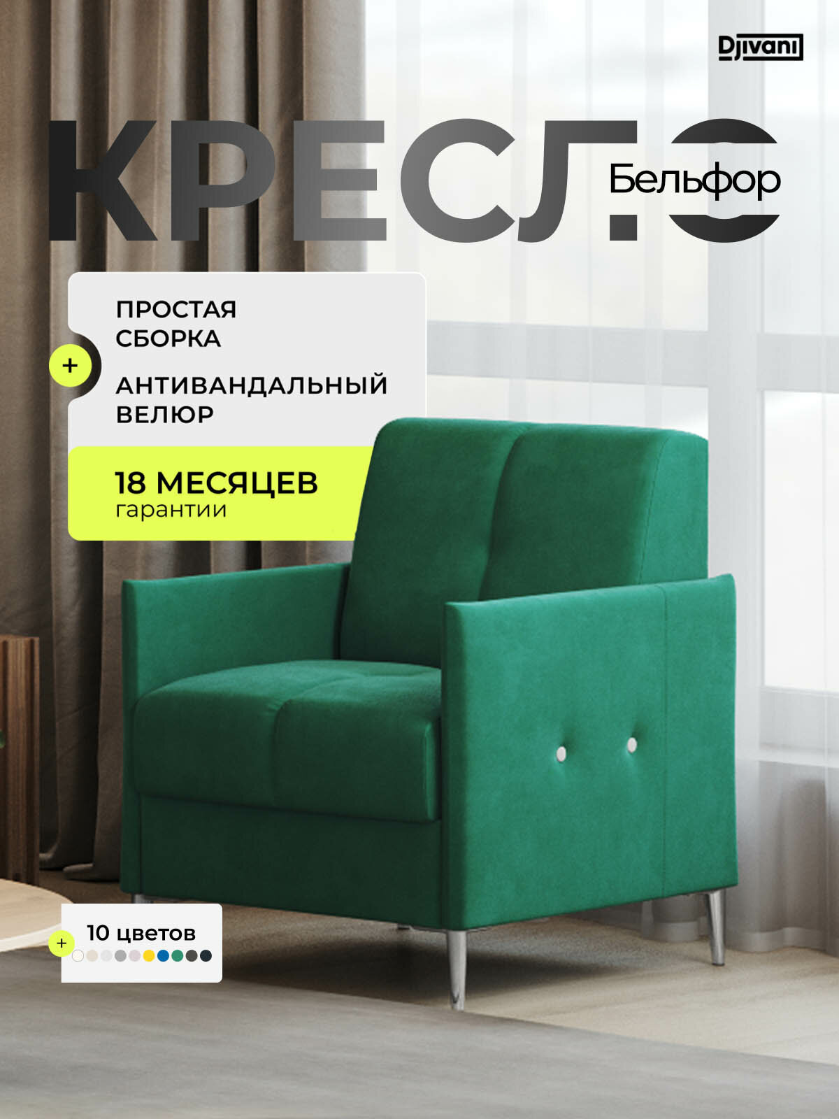 Купить Кресло Djivani Бельфор , с подлокотниками, велюр, зелёный, ножки — хром с доставкой по всей России. Кресло Djivani Бельфор , с подлокотниками, велюр, зелёный, ножки — хром: сравнение цен, характеристики, фото, актуальное наличие и цены.