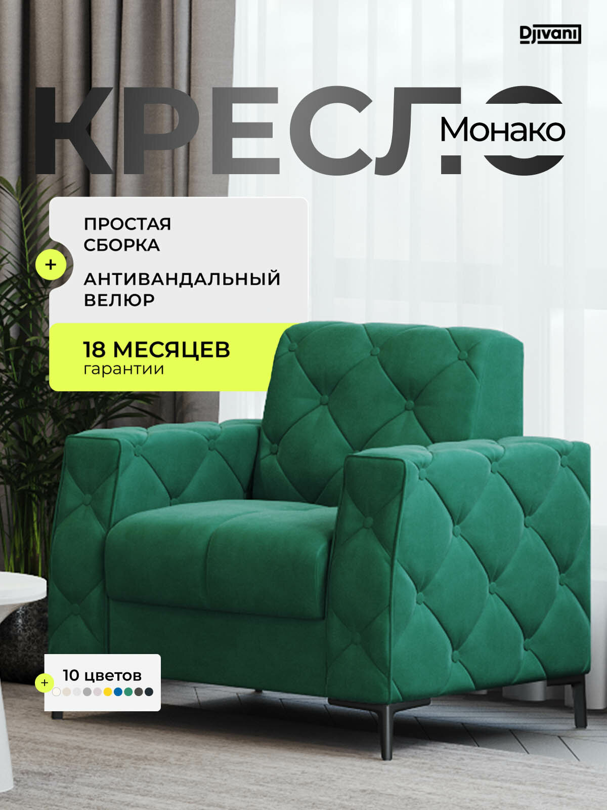 Купить Кресло Djivani Монако, с подлокотниками, велюр, зелёный, ножки — чёрные с доставкой по всей России. Кресло Djivani Монако, с подлокотниками, велюр, зелёный, ножки — чёрные: сравнение цен, характеристики, фото, актуальное наличие и цены.