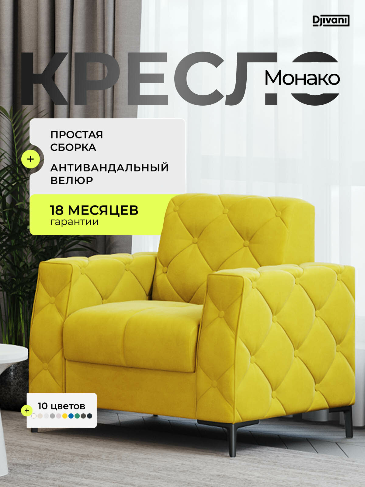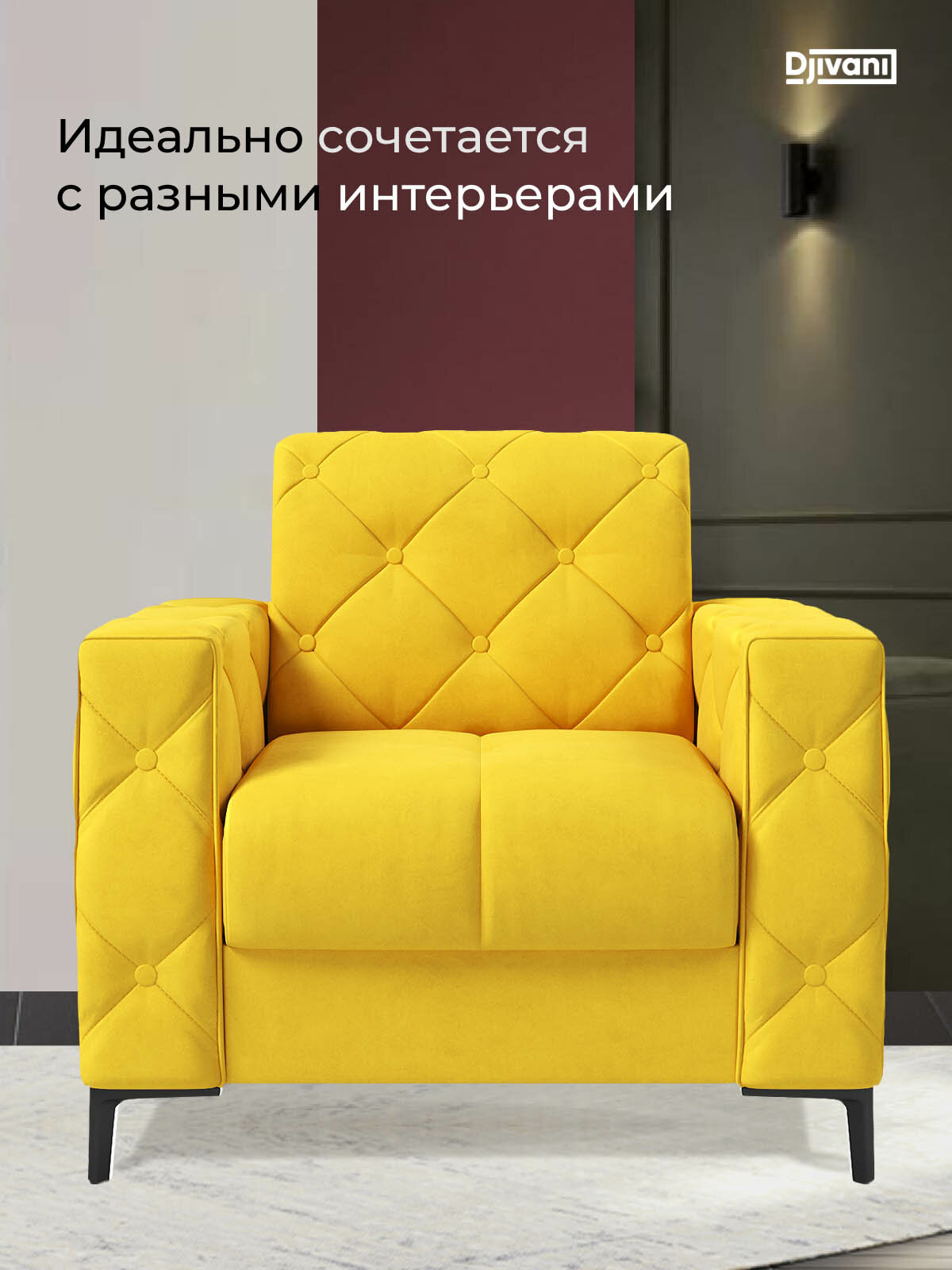 Купить Кресло Djivani Монако , с подлокотниками, велюр, жёлтый, ножки — чёрные с доставкой по всей России. Кресло Djivani Монако , с подлокотниками, велюр, жёлтый, ножки — чёрные: сравнение цен, характеристики, фото, актуальное наличие и цены.