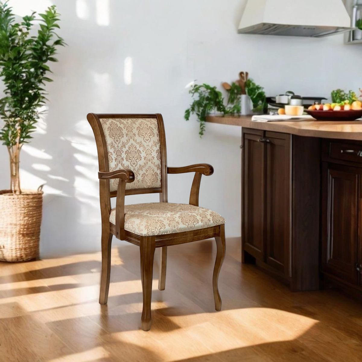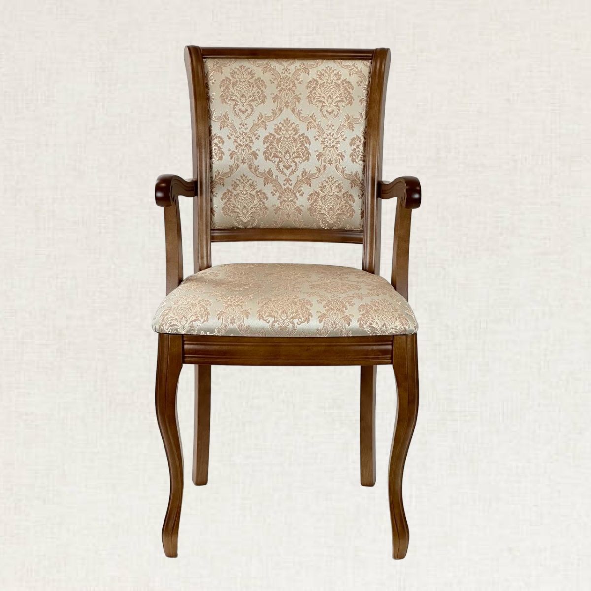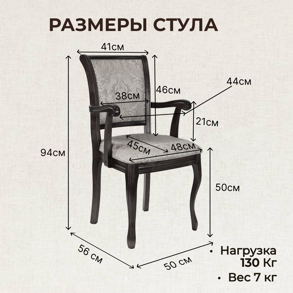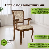 Стул кухонный с подлокотниками с мягкими спинкой и сиденьем — красивый, комфортный, удобный и практичный. Каркас изготовлен из массива дерева березы, что обеспечивает ему повышенную прочность и это несомненное преимущество. Кресло в комнату обито износостойким жаккардом. Отличительная особенность - вензельный рисунок. Не деформируется и не мнётся, хорошая упругость на растяжение. Тактильная поверхность надолго сохранит свой первоначальное состояние и эксплуатационные характеристики. Стульчик имеет правильную посадку, благодаря эргономичной форме вы будете получать сплошное удовольствие от использования. Достоинство модели - экологичность и долговечность. Основательные, надёжные стулья для кухни и гостиной гармоничны в любом интерьере. Идеально подойдёт для спальни, столовой, бара, ресторана и любого другого помещения. Замечательный подарок близким друзьям родителям на новоселье свадьбу после ремонта годовщину без повода. Хорошо упакован для транспортировки. Поставляется собранным.
