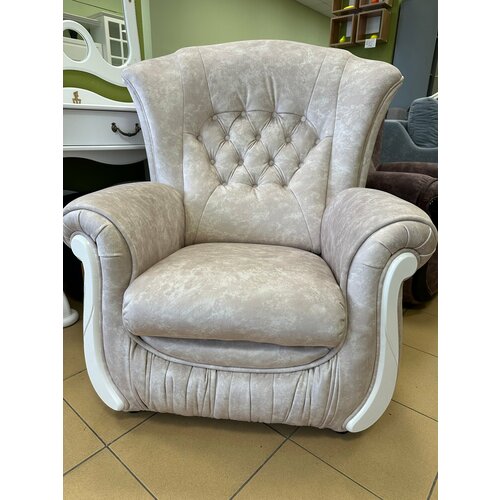 Кресло оснащено мягкими подлокотниками и красивым натуральным, деревянным светлым декором молочного оттенка , что придает классическую не уходящую из моды изящность.
