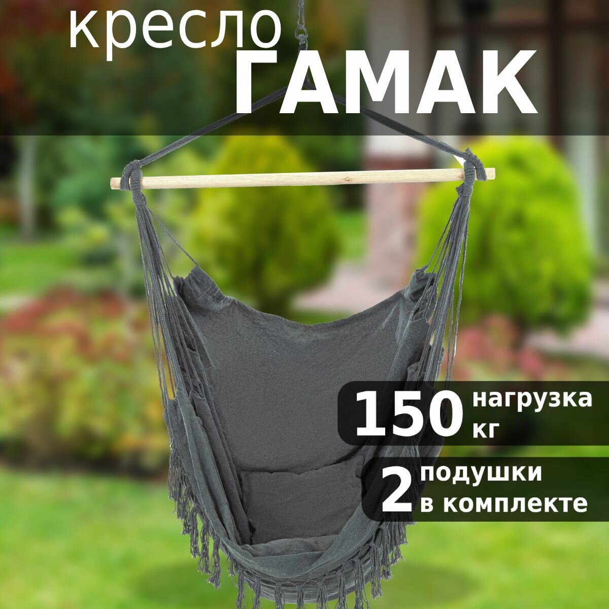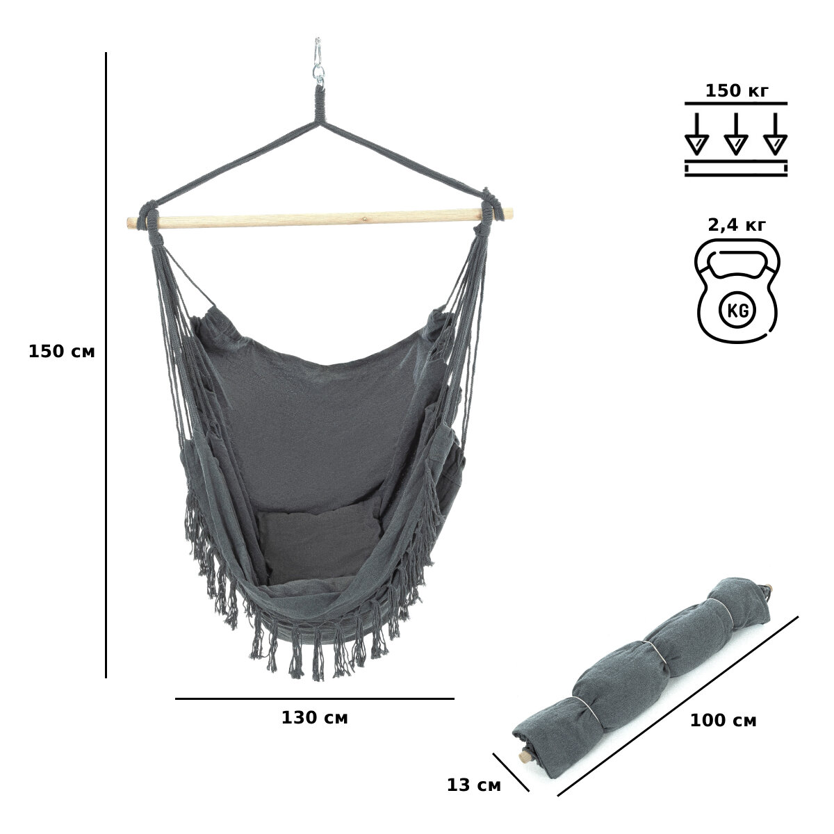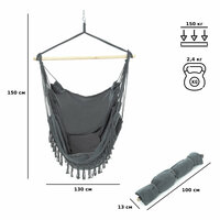 Сочетание удобных размеров 150х130 см, прочного материала из хлопка и деревянного держателя обеспечивает надежность и комфорт во время использования. Темно-серый цвет гамака придает ему элегантный и стильный вид.