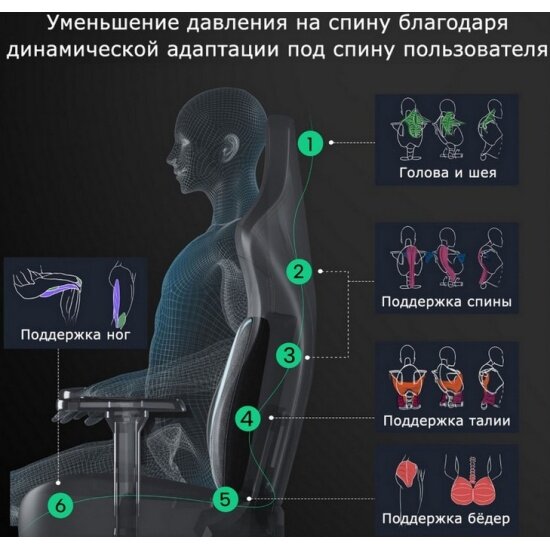 Встроенная 4D регулируемая адаптивная поясничная поддержка автоматически регулирует угол в соответствии с позицией пользователя и обеспечивает комфорт в течение всего дня. Утолщенная подушка из пеноматериала - это лучшая поддержка баланса. Она эффективно распределяет вес на бедрах. Умные регулируемые подлокотники 4D регулируются по высоте, в стороны, спереди и сзади, а также внутри и снаружи, чтобы расслабить плечи и руки и снять усталость. Они обеспечивает надежную поддержку и защиту в течение долгих часов игр. Многофункциональный механизм и регулировка наклона - отрегулируйте высоту и угол наклона, чтобы вам было удобно. Технические характеристики: