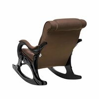 Кресло-качалка традиционной конструкции. Боковины и подлокотники данной модели изготовлены из дерева. Кресло-качалка имеет удобную выдвижную подножку. Максимальный комфорт во время отдыха создают эргономичная форма сиденья и спинки, мягкие подголовник и подлокотники, угол наклона кресла и оптимальная амплитуда качания. Обивка выполнена из экокожи. Высота от пола до сиденья — 420, ближе к спинке — 350. Амплитуда качания: вперед — 12 градусов, назад — 17 градусов. Угол наклона спинки 100° Высота подлокотников от сиденья — 215 Ширина боковины с подлокотником ~ 55 Высота от пола до самой нижней части мягкого элемента - 220 Ширина сиденья — 570 Глубина сиденья — 510 Высота спинки — 810