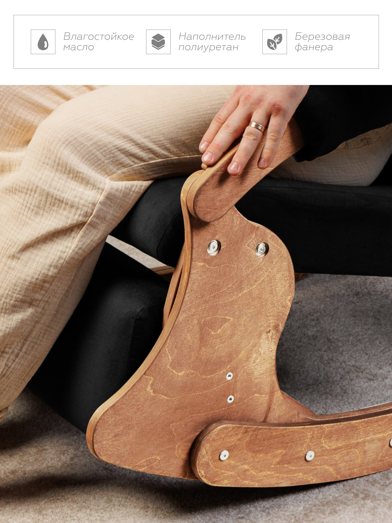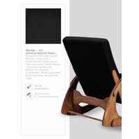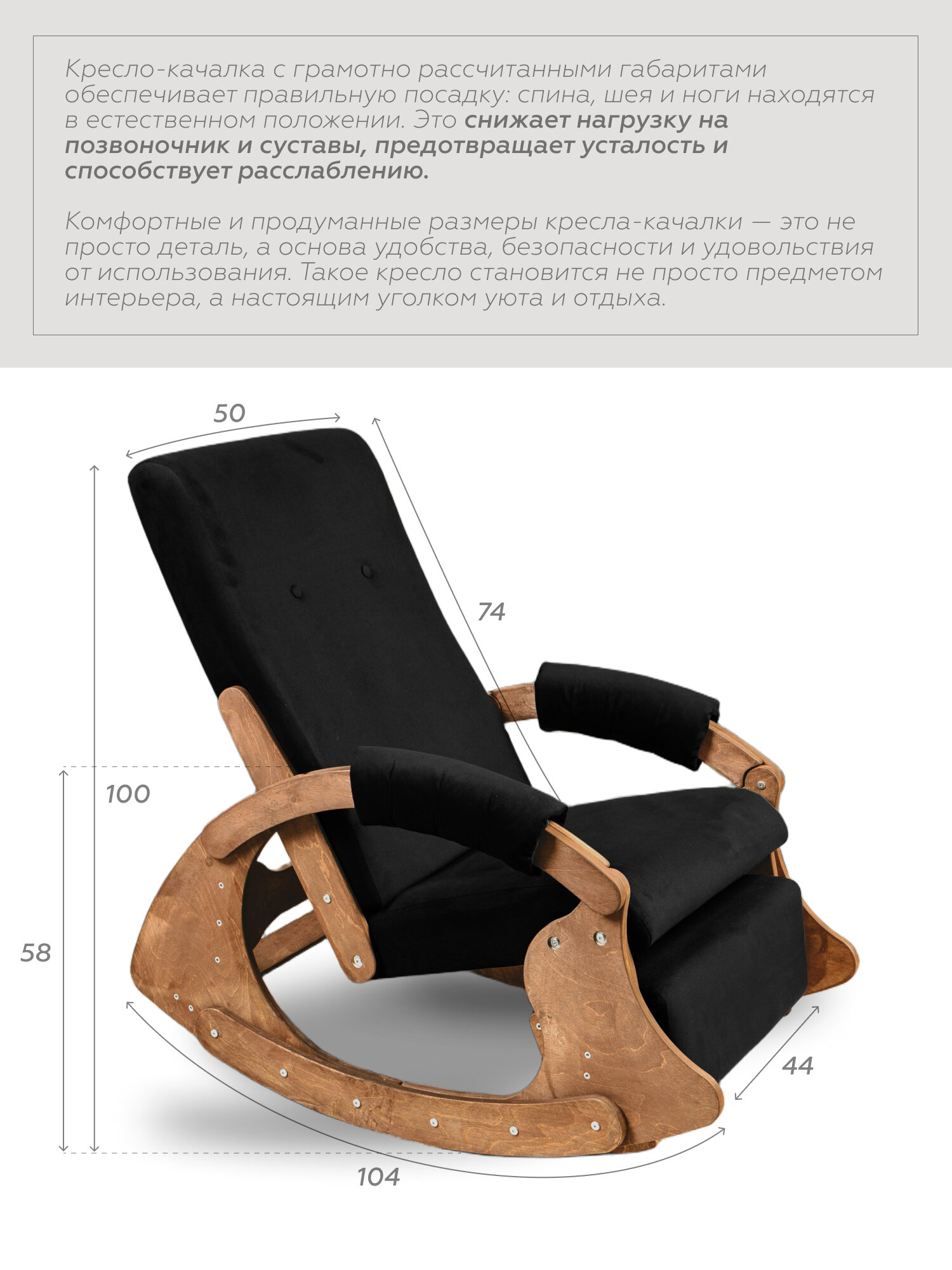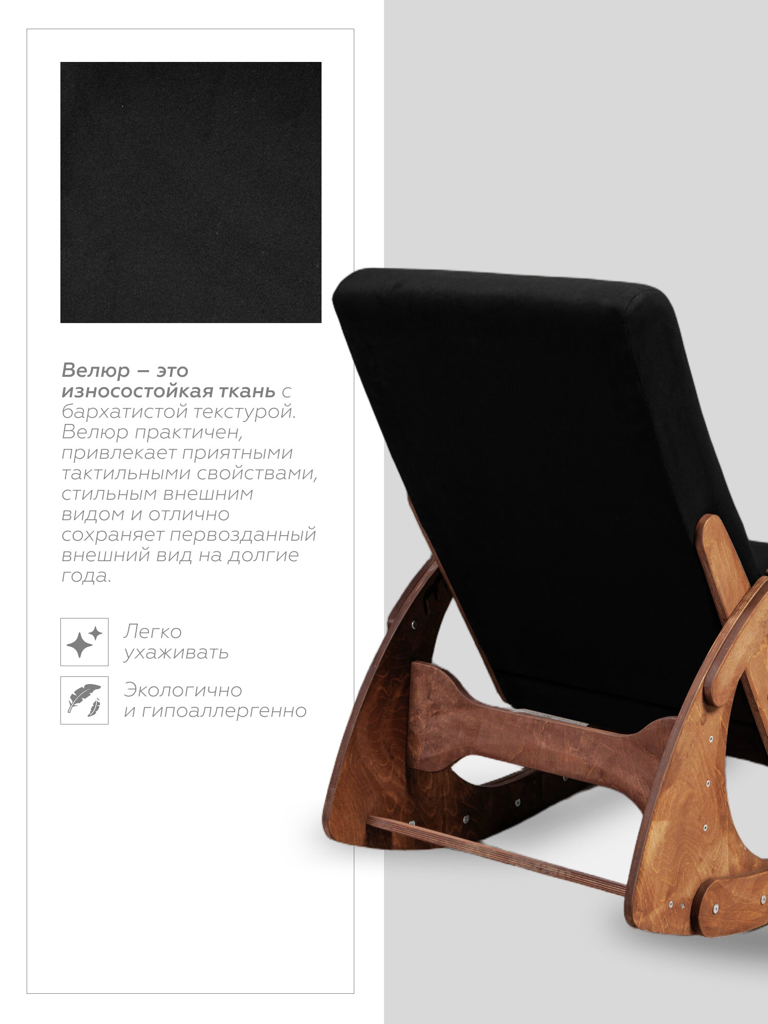 Кресло-качалка "Бриз" выполнено в классическом стиле, что позволяет ему гармонично вписаться в любой интерьер. Обивка из черного велюра придает креслу изысканный вид и делает его мягким и приятным на ощупь.