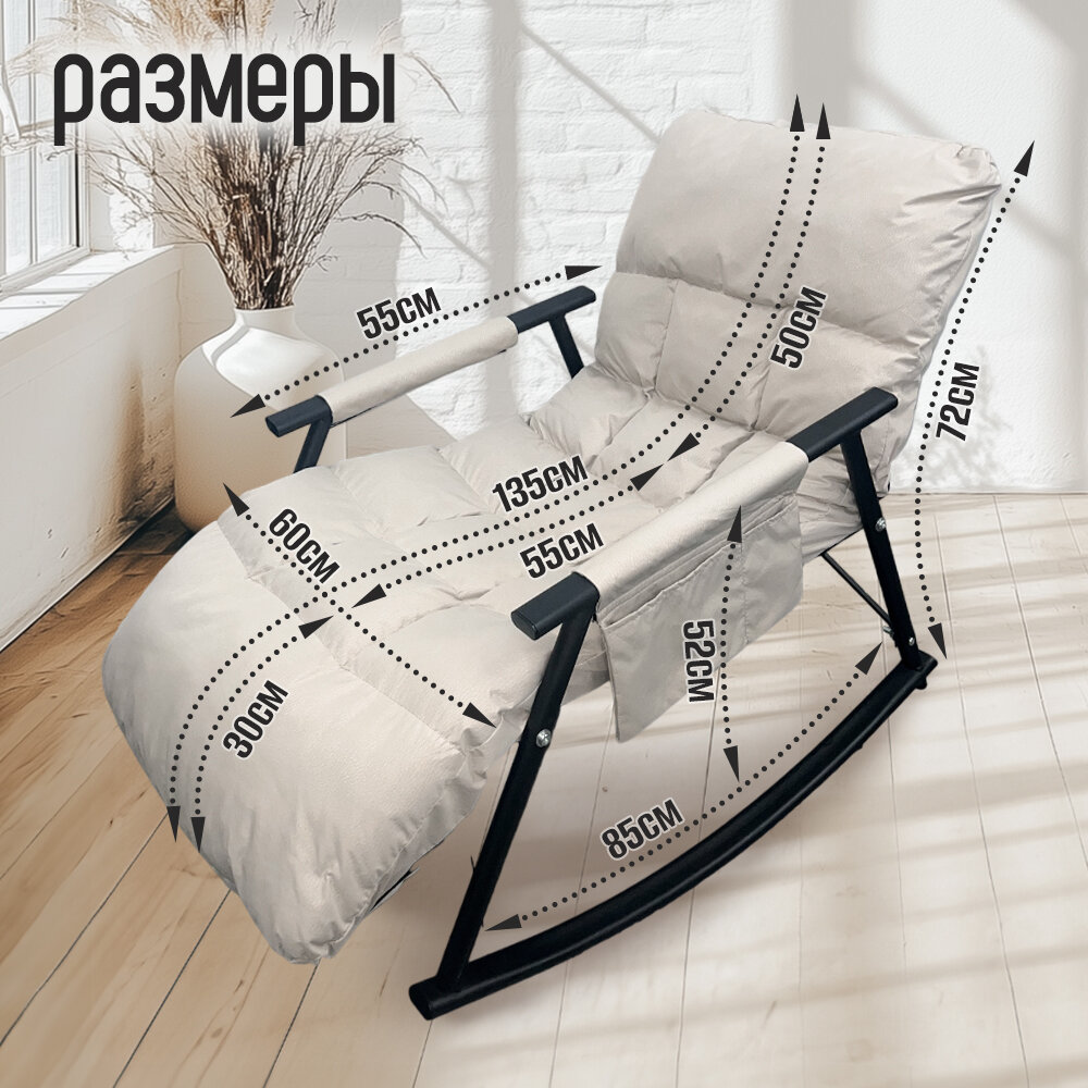 Регулируемый угол наклона: Это кресло-качалка может наклоняться вперед на 15° и назад на 30°, спинка регулируется в пяти положениях, обеспечивая комфортные углы наклона. Высококачественная ткань: Изготовлено из технологичной ткани, приятной на ощупь, износостойкой и прочной, легко очищаемой, что гарантирует эстетичный вид при длительном использовании. Прочная рама: Каркас из углеродистой стали прочен и долговечен, обеспечивает безопасность и устойчивость кресла-качалки при использовании, выдерживает нагрузку до 120 кг. Комфортное наполнение: Внутреннее наполнение из высокоэластичных волокон и губки обеспечивает превосходную поддержку и комфорт, позволяя вам расслабиться в любой позе. Многофункциональный дизайн: Это кресло-качалка подходит как для сидения, так и для лежания, поддержка для ног также регулируется, удовлетворяя ваши потребности в различных ситуациях, является идеальным выбором для домашнего отдыха. Представьте себе: после напряженного дня вы возвращаетесь домой, где вас встречает не только уютное освещение, но и кресло-качалка специально разработанное для вашего комфорта. Оно позволяет вам найти наиболее удобный угол для чтения, отдыха или даже короткого сна. Будь то наслаждение тихим временем в гостиной или солнечные ванны на балконе, это кресло-качалка удовлетворит все ваши потребности.