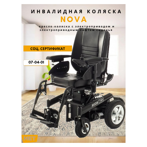 Электрическое кресло-коляска с лифтом (MET NOVA), поднимающим сиденье с пользователем с помощью электроактуатора, выполнено в спокойном и респектабельном классическом дизайне, обладает выверенным конструктивом и надёжным функционалом электрооснащения. Цвет рамы - оранжевый.