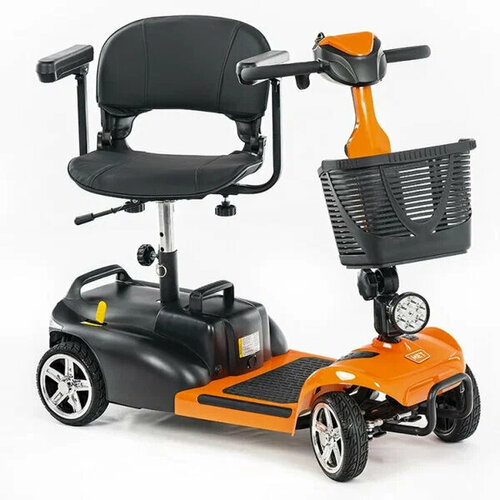 Электрический скутер снабжённый рулём мотоциклетного типа и поворотным сиденьем с откидывающимися подлокотниками, которое делает посадку и высадку из кресла элементарной даже для пользователей, имеющих ощутимые трудности с перемещением.