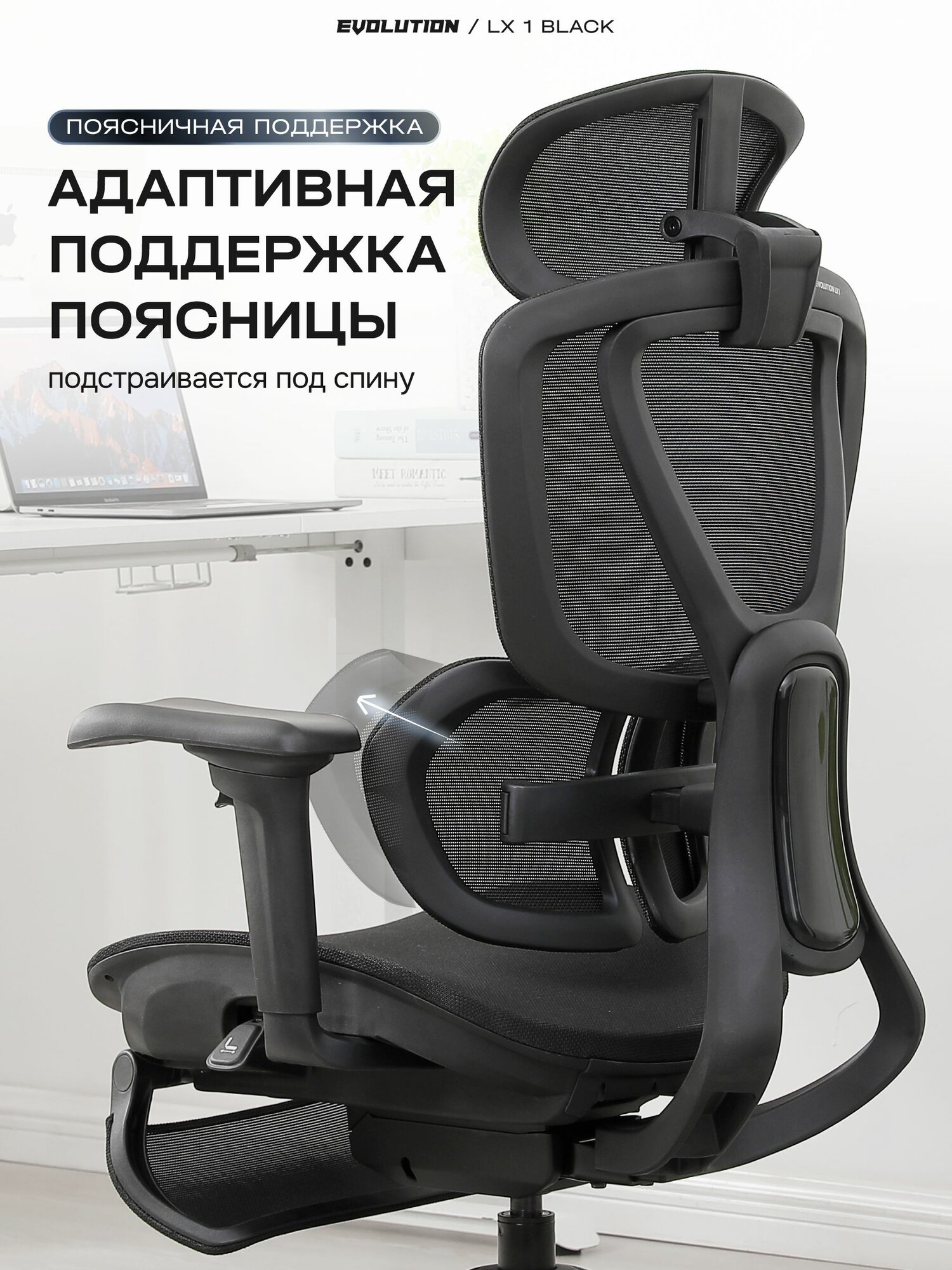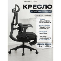 Кресло компьютерное EVOLUTION LX 1 Black, эргономичное, офисное, с 3D подлокотниками, подставкой для ног и подголовником
