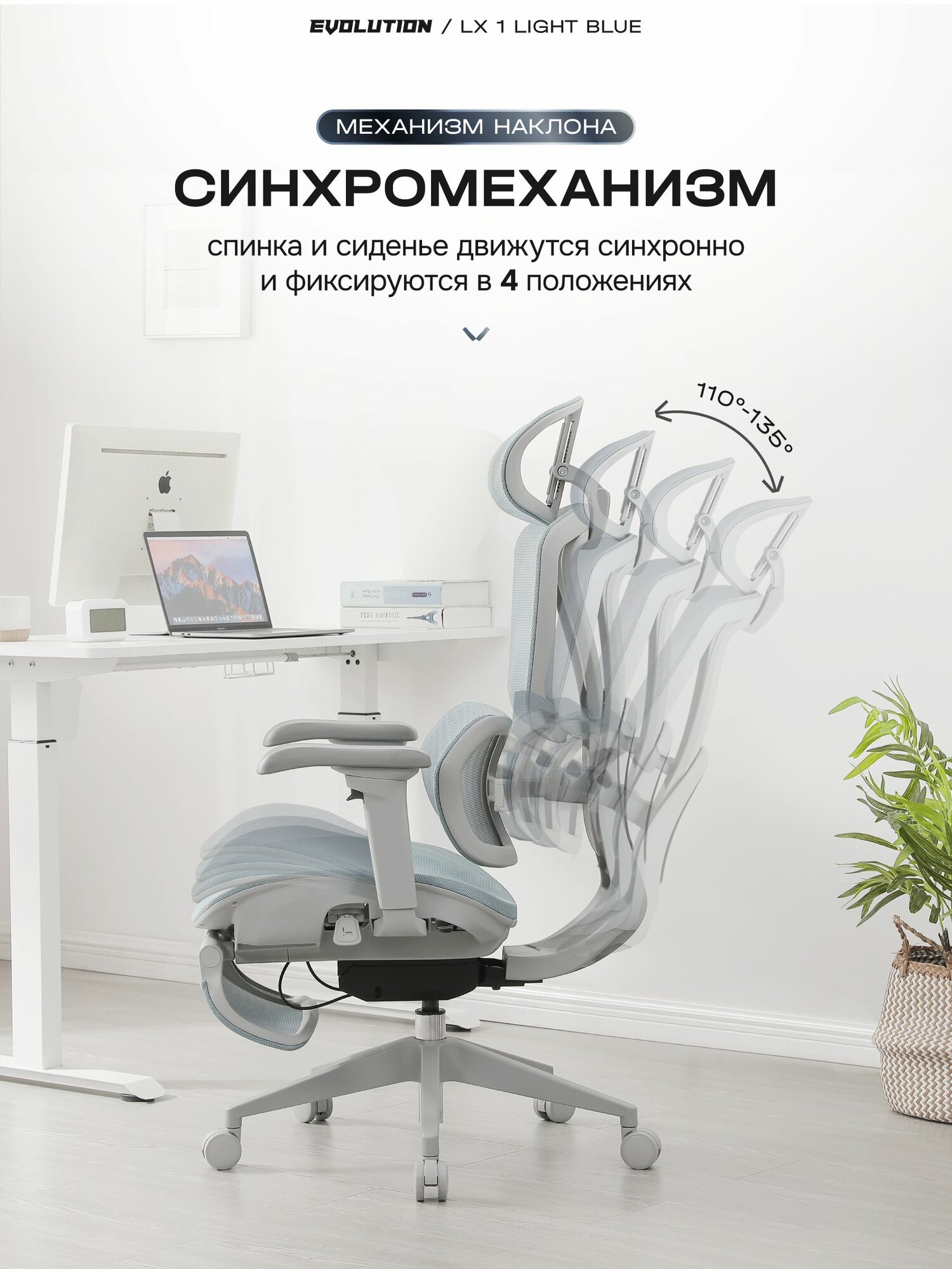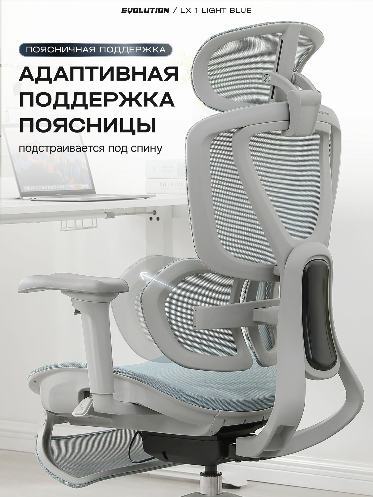 Кресло компьютерное EVOLUTION LX 1 Light Blue, эргономичное, офисное, с 3D подлокотниками, синхромеханизмом, сетка