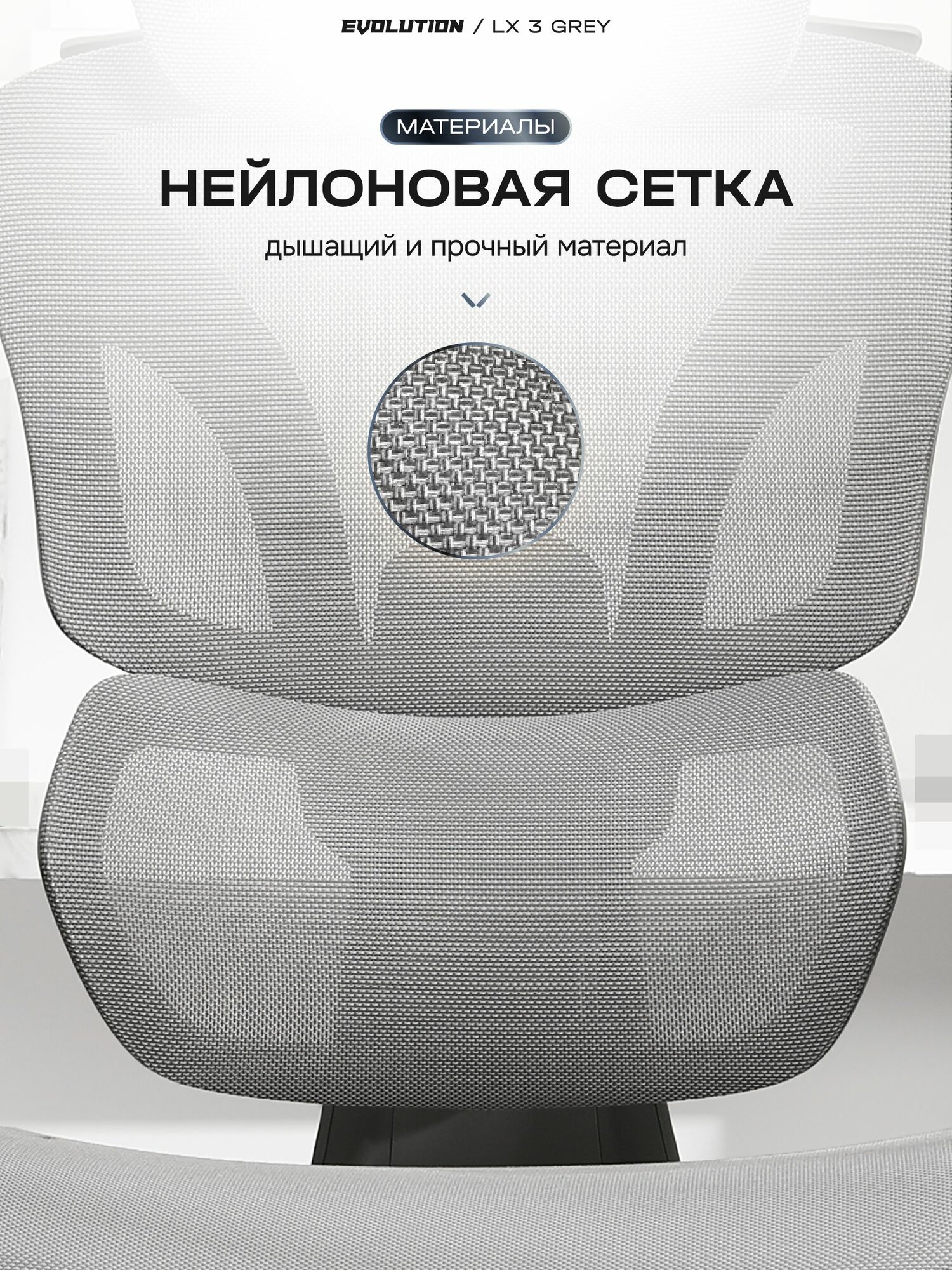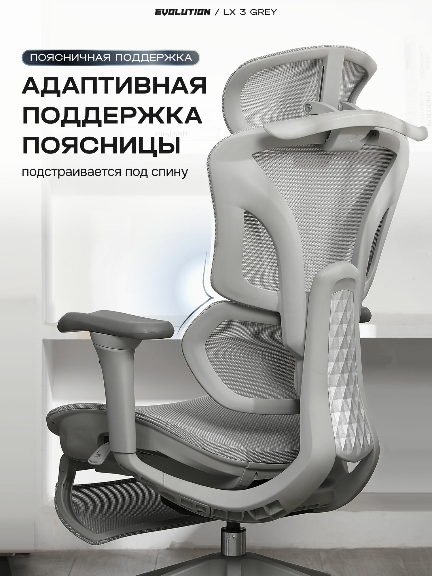 Кресло компьютерное EVOLUTION LX 3 Grey, офисное, эргономичное с 4D подлокотниками, подголовником, сетка