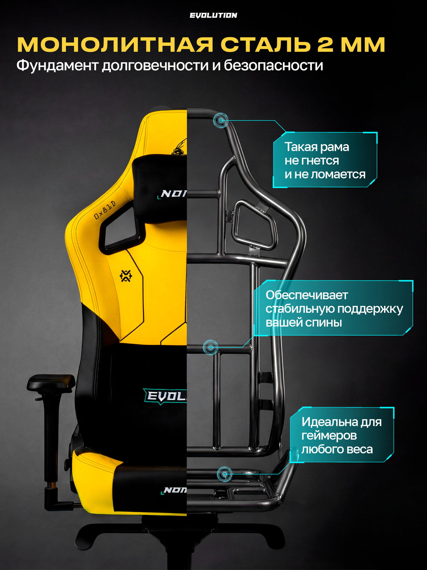 Модель выполнена в футуристическом дизайне с элементами стиля Cyberpunk, идеально подходящем для современных интерьеров. Прочная металлическая рама гарантирует надежность даже при длительном использовании.
