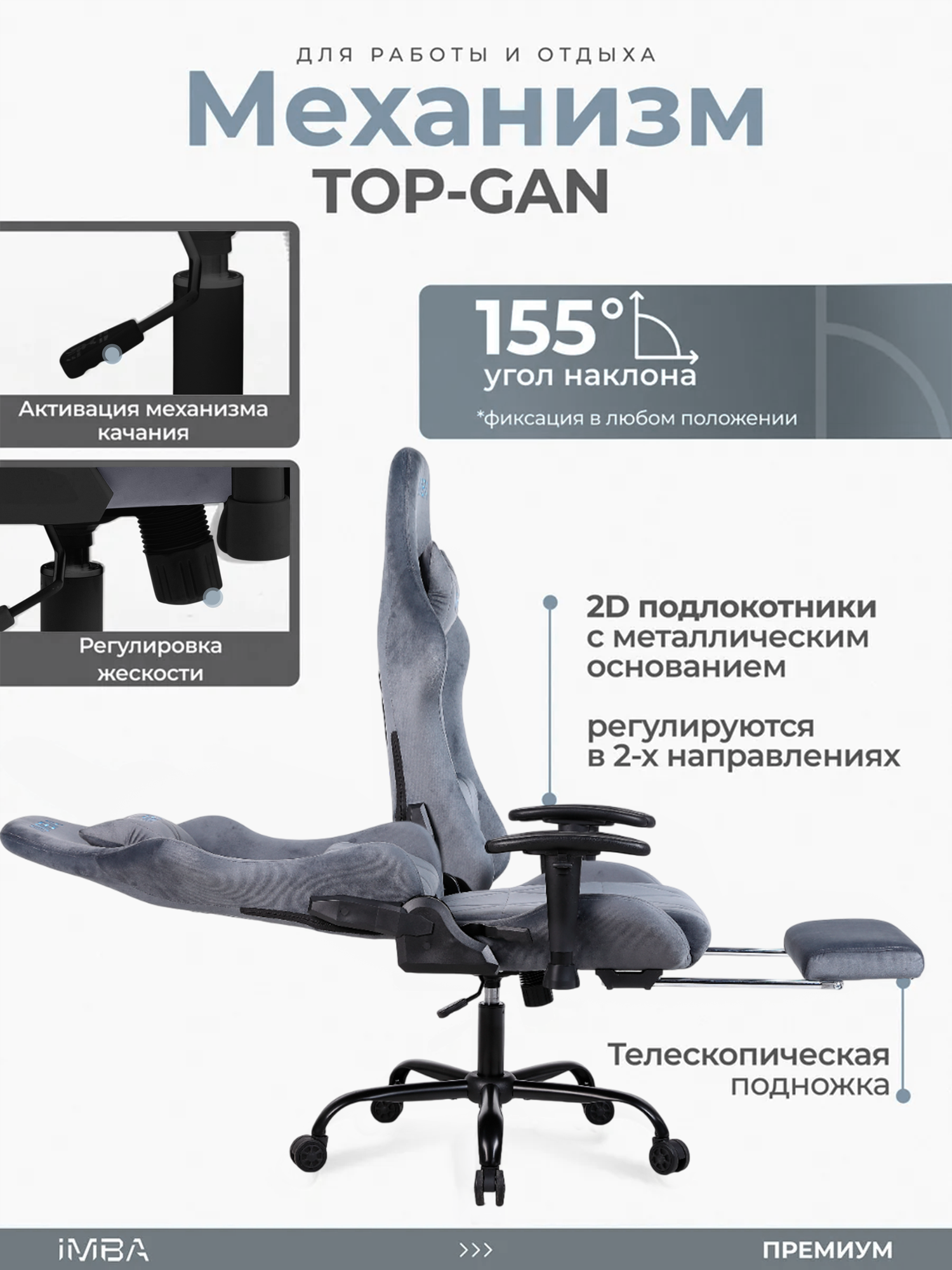 Кресло компьютерное игровое IMBA - это специализированная мебель, созданная специально для геймеров. Оно отличается от обычного стула игровым дизайном, удобством и функциональностью. Игровое кресло на колесиках позволяет геймеру легко передвигаться по комнате, не вставая с места. Металлический каркас и крестовина гарантируют прочность и долговечность кресла. Геймерское кресло с высокой спинкой и регулируемыми по высоте подушками позволят настроить комфортную посадку под любой рост. Модель оснащена подголовником, который можно регулировать по высоте, а также поясничным упором и сиденьем, что позволяет настроить кресло под индивидуальные предпочтения пользователя. Регулируемая спинка позволяет откидываться до 155 градусов, создавая комфортное положение для отдыха. Антивандальная обивка из велюра обеспечивает исключительную мягкость и приятный тактильный контакт, что делает игровой процесс еще более комфортным и приятным. Это кресло компьютерное игровое геймерское отличается особой прочностью и надежностью, специально рассчитано на выдерживание веса до 140 кг. Специальная конструкция с подставкой для ног обеспечивает дополнительный комфорт во время продолжительных игровых сессий. Кресло обычно имеет мягкое сиденье и спинку, а также удобные подлокотники, которые помогают расслабиться и избежать усталости во время игры. Газлифт 3 класс обеспечивает плавную регулировку высоты, а прорезиненные колесики обеспечивают плавное и бесшумное движение. Механизм качания топ-ган позволяет регулировать угол наклона спинки и фиксировать его в нескольких положениях.