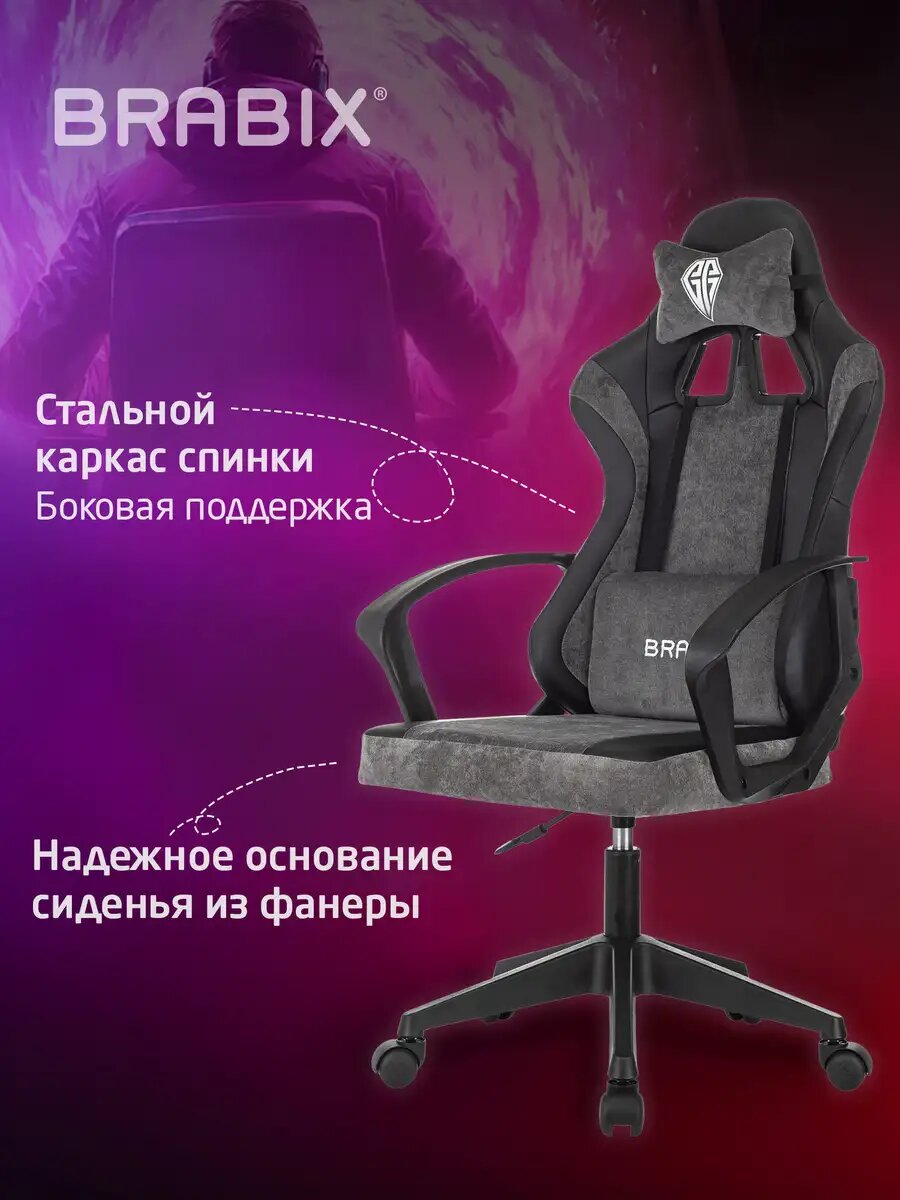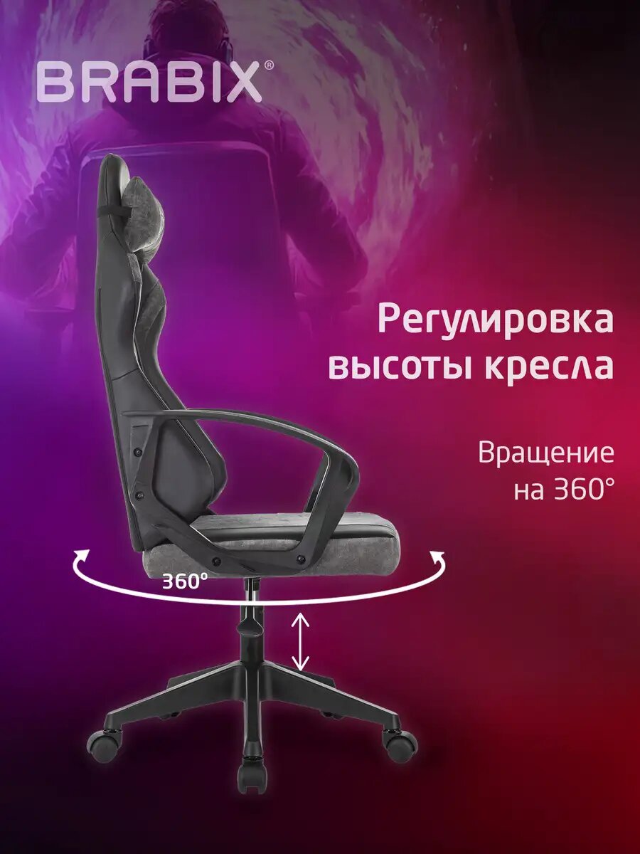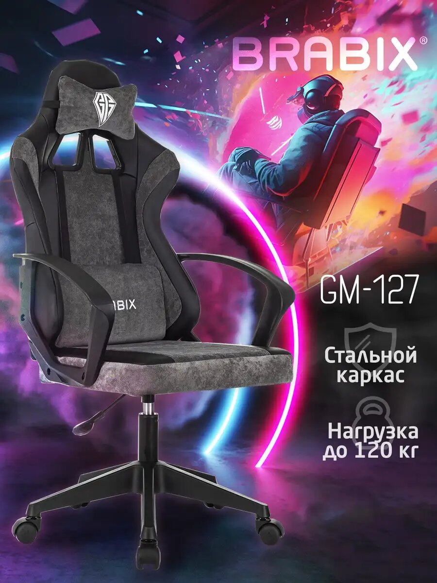 Кресло компьютерное игровое офисное геймерское, стул на колесиках для школьника и взрослого, 2 подушки, экокожа/велюр, черное/серое, Brabix, 533216: сравнение цен, характеристики, фото, актуальное наличие и цены.