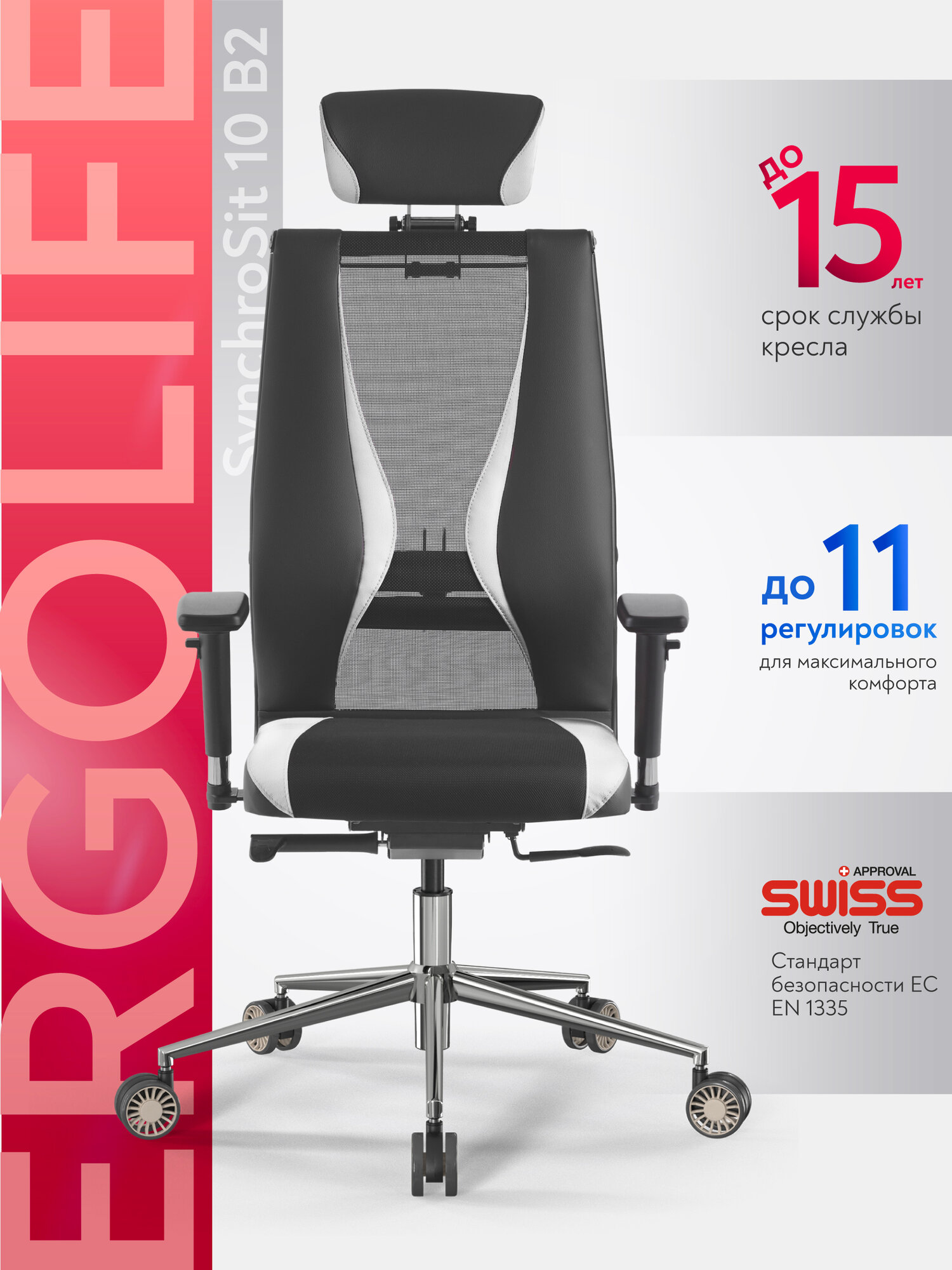 | Регулировка | высоты подголовника, высоты подлокотников, высоты поясничного упора, высоты сиденья, глубины положения подлокотников, глубины сиденья, наклона спинки, угла наклона подголовника, угла подлокотников |