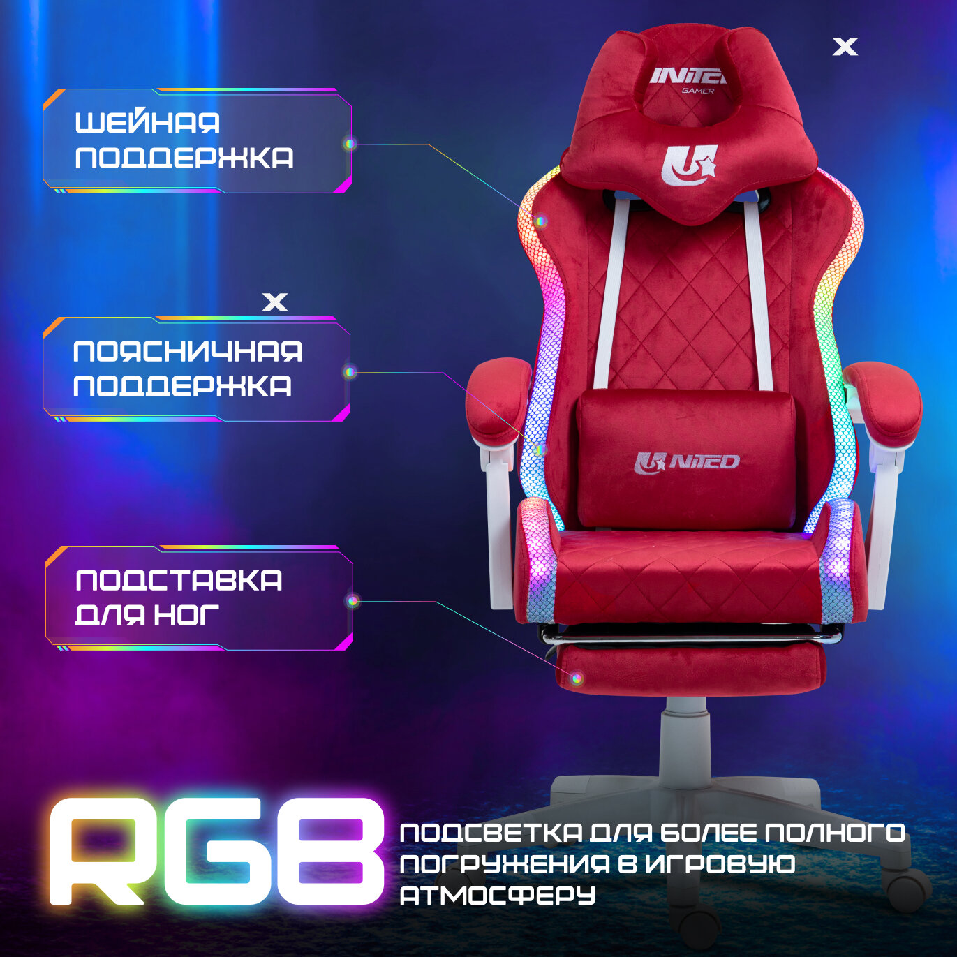 Купить Кресло компьютерное UNITED GAMER PINK FLASH, RGB-подсветка, подставка для ног с доставкой по всей России. Кресло компьютерное UNITED GAMER PINK FLASH, RGB-подсветка, подставка для ног: сравнение цен, характеристики, фото, актуальное наличие и цены.