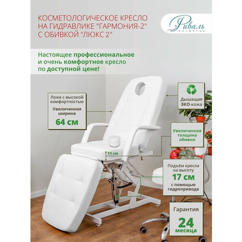 · Косметологическое кресло кушетка, СПА - комплекс, Риваль Гармония-2 обивка Люкс 2, с регулировкой высоты на гидравлике, усиленной спинкой, эко. С вырезом для лица и заглушкой. · Регулировка угла наклона спины и ног, механическая. · Данная модель имеет усиленные узлы крепления всех отклоняющихся частей каркаса (спина и ноги). · Для сохранения устойчивости кресла, ее верхняя платформа установлена на пантографическом механизме. · Регулировка спинки и подножной части позволят разложить кресло до полностью горизонтального положения и комфортно использовать в качестве косметологической кушетки. · Материал каркаса - из металлической трубы, окрашен высокопрочной, глянцевой порошковой краской. · Материал обивки - матовая, не скользящая, высококачественная, износостойкая экокожа производства Турции, толстый слой поролона, все это обеспечит удобство и комфорт клиенту во время процедуры. · Стильный лаконичный дизайн подойдет для любого интерьера студии или салона красоты. · Кресло очень удобно и функционально в эксплуатации благодаря преимуществам: для косметолога, для визажиста, для эстетиста, для наращивания ресниц, для тату, для мастера: · - Более комфортная, удобная, толстая обивка; · - Повышенная прочность и устойчивость; · - Регулировка высоты на гидроподъёмнике с дополнительным подъемным рычагом и наклоном спинной части с помощью пневмопривода; · - Усиленная спинка; · - Быстросъемные подлокотники; · - Фиксация в нужном положении; · - Регулировка высоты кресла; · - Рассчитано на нагрузку до 200 кг; · - Регулировка угла наклона спины и ног, механическая; · - Быстрая сборка. · Параметры: · - Толщина обивки 11 см · - Ширина - 64 см · - Ширина с подлокотниками - 80 см · - Длина – 180 см · - Высота (регулируется) – от 66 см до 82 см