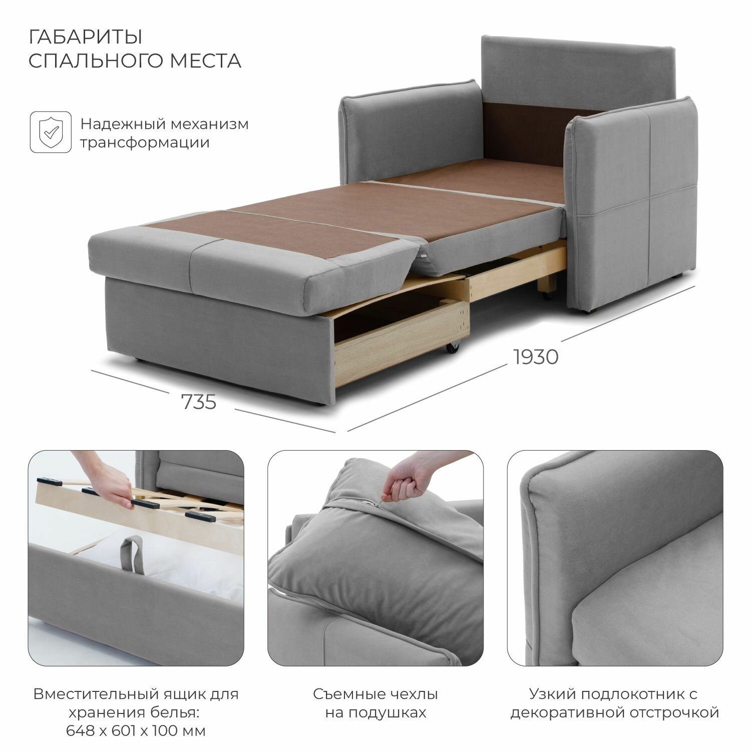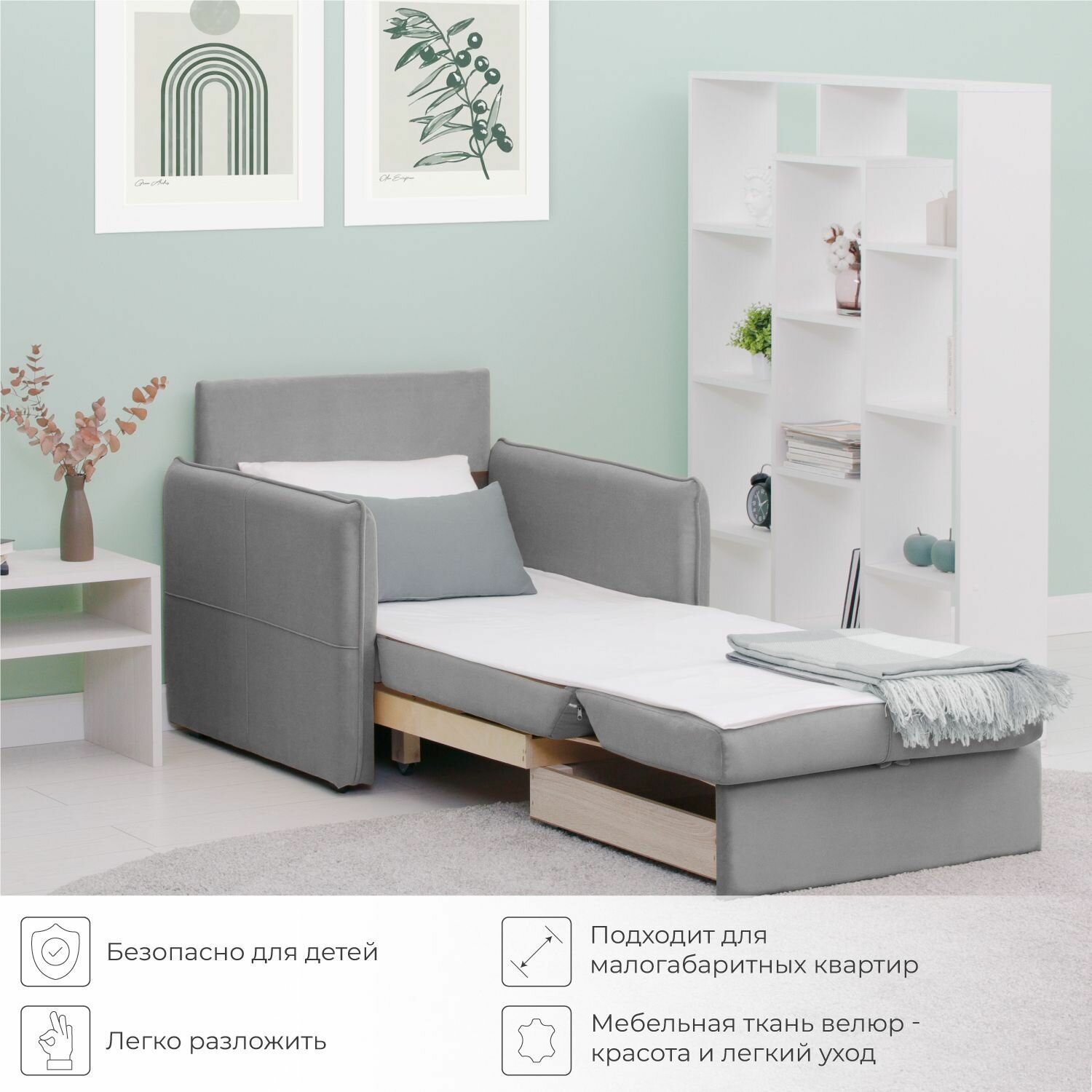 Кресло - кровать раскладное Funny - станет прекрасным дополнением вашего интерьера. Этот изысканное мягкое кресло предназначено для создания удобного спального места в гостиной, детской или любой другой комнате вашего дома. В меру мягкая обивка из велюра и прочный каркас обеспечивают высочайший комфорт и долговечность. Кресло легко раскладывается, превращаясь в кровать (размер спального места 735*1930 мм.), на которой можно отдохнуть после напряженного дня или разместить гостей. Для комфортного отдыха предусмотрена декоративная подушка. Кресло раскладное разработано таким образом, чтобы не занимать много места, будучи компактным в собранном состоянии, что делает его идеальным вариантом даже для небольших помещений. Одной из главных особенностей этого кресла c подлокотниками является наличие вместительного ящика для хранения постельных принадлежностей или любых других вещей, что позволяет экономить место и поддерживать порядок в комнате. Серый оттенок кресла Funny гармонично впишется в любой стиль интерьера — от классического до современного, добавляя помещению ощущение легкости и уюта. Кресло - кровать Funny отлично подходит и для детской комнаты, так как его компактные размеры и практичная функция раскладывания позволяют использовать пространство максимально эффективно. Комфортное спальное место обеспечит вашему ребенку здоровый сон, а стильный дизайн порадует глаз и создаст уютную атмосферу. Кресло для отдыха — это не просто мебель, а еще и возможность приучить малыша к порядку, предлагая удобный ящик для хранения игрушек и других предметов. Таким образом, кресло Nrava Funny является идеальным выбором для всех, кто ценит функциональность, стиль и уют.