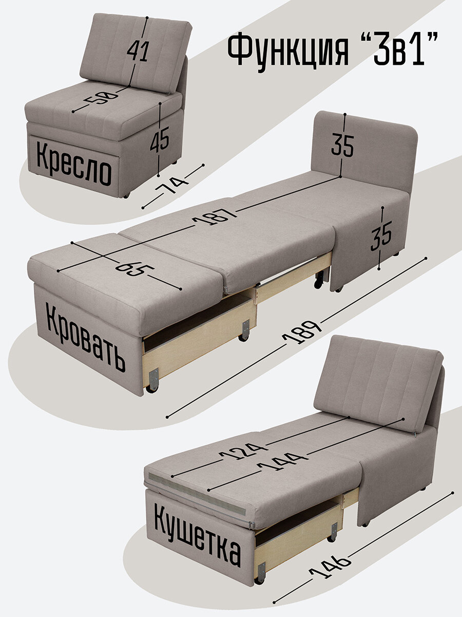• спальное место, когда кресло разложено на 2/3 длины (кушетка/на вырост) - 65х144х35,