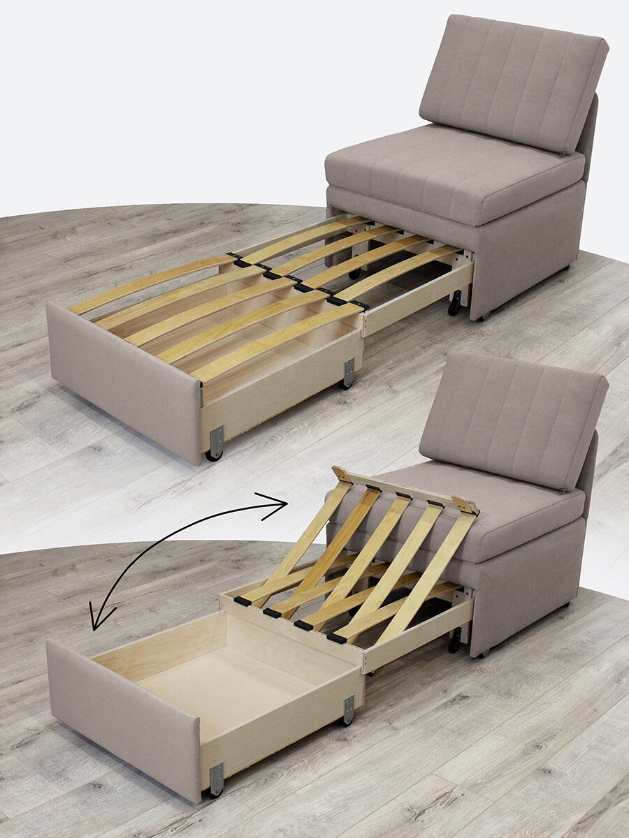 Обращаем Ваше внимание, что в разложенном виде кресло-кровать может скользить на глянцевом полу, т. к. стоит на двух ножках и колесах. Размер и конструкция колес не предполагает наличие стопора (тормоза). В комплект входят два антискользящих подпятника, которые нужно приклеить на задние ножки.