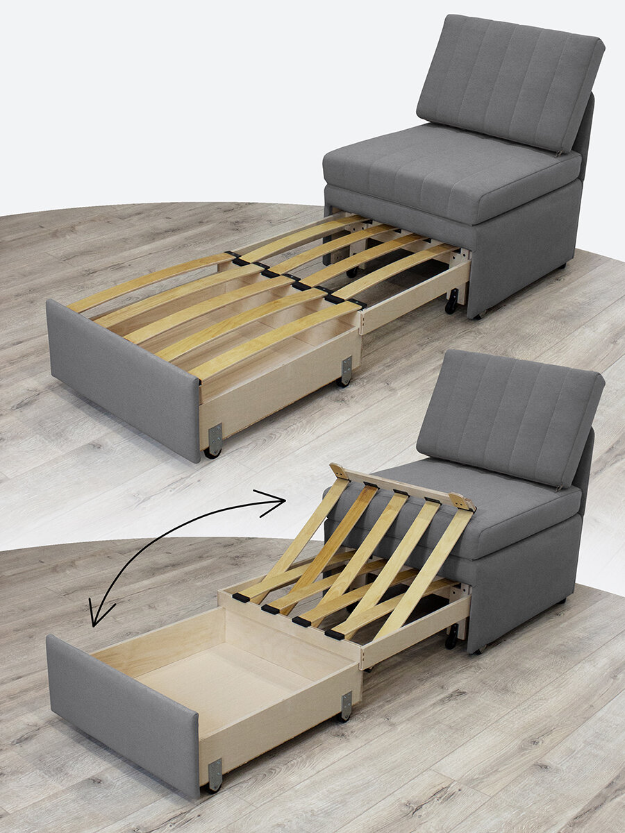 Обращаем Ваше внимание, что в разложенном виде кресло-кровать может скользить на глянцевом полу, т. к. стоит на двух ножках и колесах. Размер и конструкция колес не предполагает наличие стопора (тормоза). В комплект входят два антискользящих подпятника, которые нужно приклеить на задние ножки.