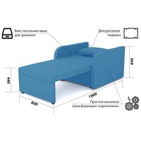 | Дополнительная информация | Кресло оборудовано ящиком для хранения постельных принадлежностей. Максимальная нагрузка - 80 кг на 1 кв.метр. Максимальная нагрузка на подлокотник - 40 кг на 1 кв.метр Если Вы хотите поставить кресло так, чтобы ежедневно раскладывать и не двигать - то кресло необходимо поставить на расстоянии 30 см от стены. Мы, в свою очередь, рекомендуем ставить кресло вплотную к стене и перемещать при необходимости. Кресло имеет малый вес, и не представляет никакого труда отодвинуть его от стены при необходимости. |