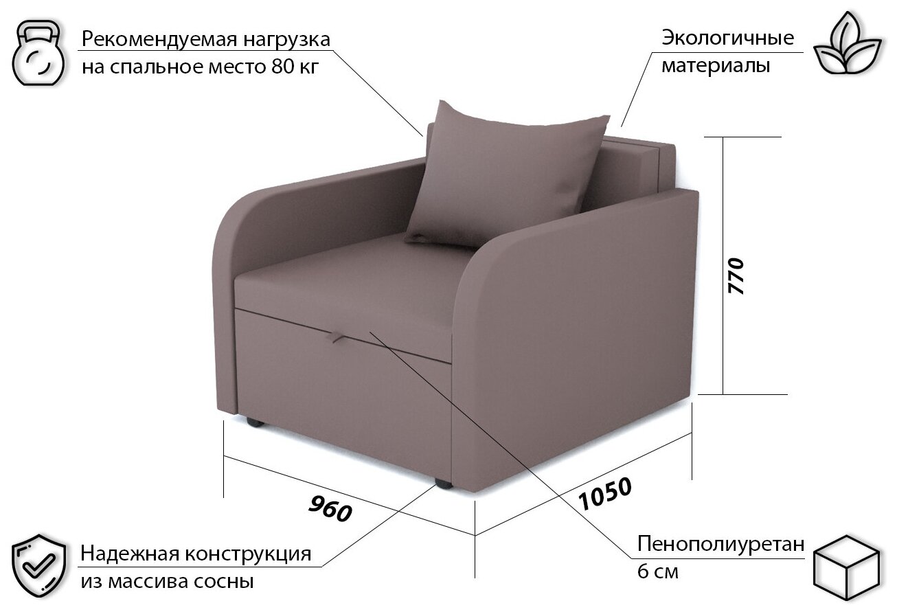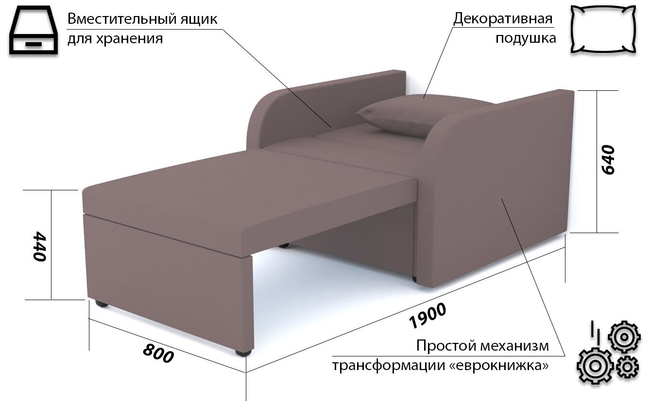 | Дополнительная информация | Кресло оборудовано ящиком для хранения постельных принадлежностей. Максимальная нагрузка - 80 кг на 1 кв.метр. Максимальная нагрузка на подлокотник - 40 кг на 1 кв.метр Если Вы хотите поставить кресло так, чтобы ежедневно раскладывать и не двигать - то кресло необходимо поставить на расстоянии 30 см от стены. Мы, в свою очередь, рекомендуем ставить кресло вплотную к стене и перемещать при необходимости. Кресло имеет малый вес, и не представляет никакого труда отодвинуть его от стены при необходимости. |