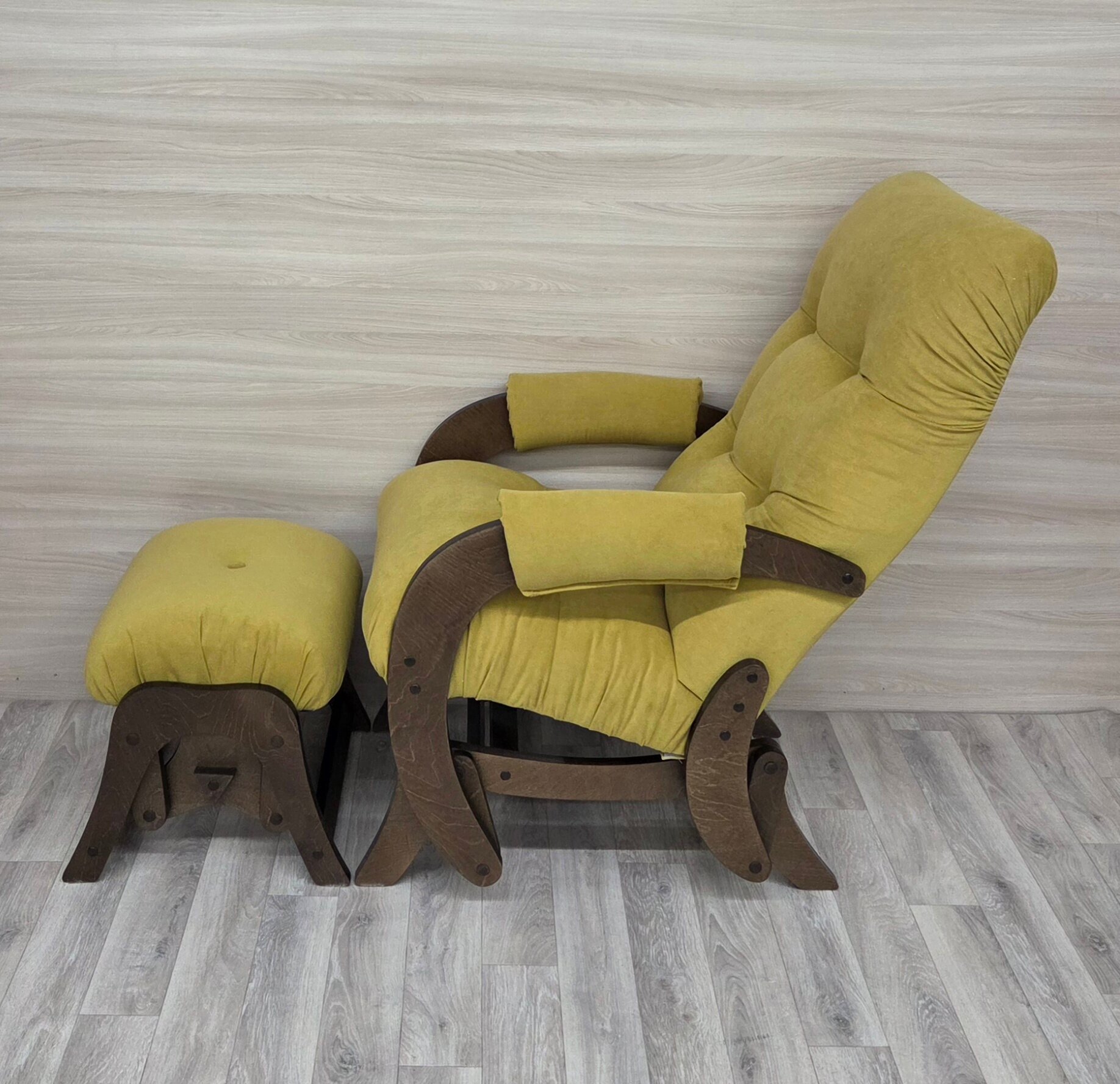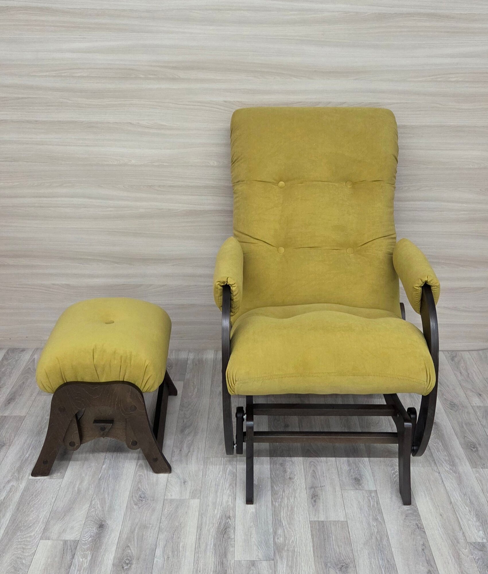 Кресло-качалка с безопасным маятниковым механизмом с пуфом-качалкой под ноги. У кресла неподвижная основа, которая соединяется с сидением при помощи специализированных маятниковых подвесок. Амплитуда раскачивания ограничена длиной подвесок. Это означает то, что кресло не перевернется и в нем можно сидеть абсолютно спокойно. Неподвижная основа кресла не повреждает напольное покрытие в доме, оно бесшумное, великолепный дизайн. Ткань велюр. Съемные чехлы на подлокотниках идут в подарок. Кресло выдерживает нагрузку до 120 кг. Такие модели часто используют не только для отдыха, но и мамами для кормления или укачивания малышей. Это кресло-качалка позволит полностью расслабиться после рабочего дня и провести приятный вечер за чтением книги или за чашечкой кофе. А пуф-качалка станет отличным дополнением к креслу. Этот комплект станет вашим настоящим домашним любимцем!