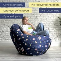 Кресло мешок мягкое с принтом, размер XXXL (90х95х135 см) имеет верхний чехол из велюра - плотной качественной ткани, которая не выгорает, антистатична, не собирает пыль. Пуфик мешок очищается пылесосом. В случае сильных загрязнений верхний чехол снимается при помощи встроенной молнии на всю высоту мешка. Внутренний чехол сшит из бязи - эта ткань намного прочнее спандбонда. Бескаркасное кресло безопасно для детских игр, а двойная отстрочка швов позволяет использовать его как батут. Наполнитель имеет свойство давать усадку со временем, поэтому мы переполняем каждое кресло-мешок на 10-15%, чтобы увеличить срок его службы. Наполнитель позволяет груше легко подстраиваться под форму тела. Кресло мешок груша идеально для дачи, на балкон, в детскую комнату. Дно кресла-груши устойчиво к частым перемещениям за счет плотной ткани оксфорд. Идеально подходит для подарка ребенку. Выдерживает нагрузку до 150 кг.