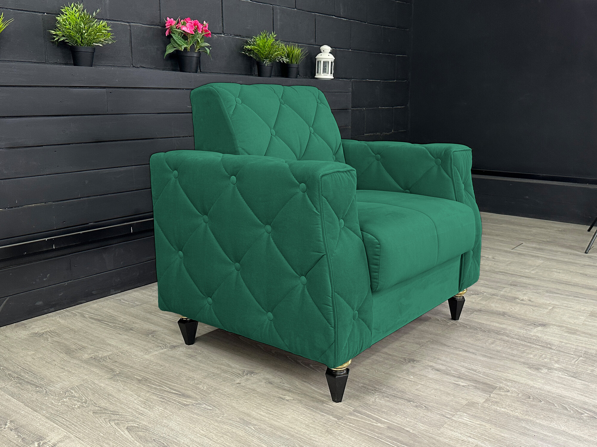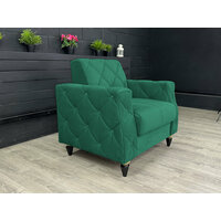 Кресло выполнено в минималистичном дизайне с однотонной велюровой обивкой, которая добавляет изысканности и элегантности. Его каркасное основание из фанеры, массива дерева, ЛДСП и ДСП обеспечивает прочность и долговечность конструкции. Наполнитель из пенополиуретана, халкона и пружины-змейки гарантирует мягкость и комфорт для отдыха.