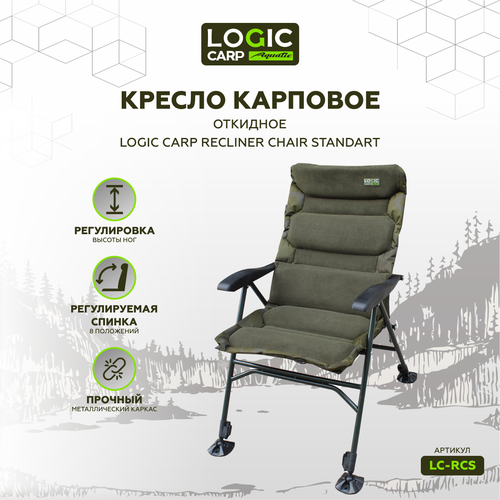 Кресло откидное Logic Carp RECLINER CHAIR standart – легкое, компактное и удобное кресло с регулируемой спинкой для отдыха на природе, рыбалке или охоте. Отличительной особенностью модели является прочный и легкий каркас из алюминиевого сплава и стали, а также его складная конструкция, что делает кресло компактным при хранении и перевозке. Широкие ножки с поворотным механизмом и круглыми опорами позволяют установить кресло на неровной поверхности и сыпучем грунте. Оно не будет проваливаться глубоко даже при максимальной весовой нагрузке. Положение спинки регулируется и устанавливается в одно из 8-ми положений, давая Вам возможность выбирать самое удобное, чтобы во время отдыха ваши мышцы не напрягались. Материал спинки и сиденья выполнены из прочного, не растягивающегося материала. Для большего комфорта они имеют большие флисовые вставки и большой объемный подголовник. Руки можно положить на широкие подлокотники, не напрягая плечи. Камуфляжная расцветка очень практичная.
