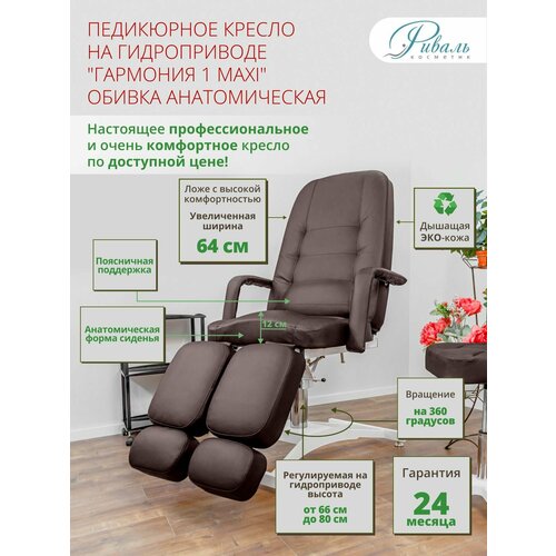 Педикюрное кресло, косметологическая кушетка, Риваль Гармония - 1, макси, с анатомической обивкой, на гидравлике, с регулировкой высоты, поворотное. Регулировка угла наклона сиденья (без клиента!) механическая и оснащена дополнительными пневматическими амортизаторами, предотвращающие резкое падение сиденья. Эта функция позволяет поднять сиденье на 15 см и уложить его вместе с ножной частью в одну плоскость. Материал каркаса - из металлической трубы, окрашен высокопрочной, глянцевой порошковой краской, материал обивки - матовая, не скользящая, высококачественная, износостойкая экокожа производства Турции , обивка повышенной комфортности (под тело человека), толщина от 9 до 13 см. Спинная часть и сиденье имеют в поясничной и паховой зонах возвышения, выполнены из более плотных сортов поролона. Возвышение (горбик) в паховой зоне, в сидячем положении, позволяет человеку «не скатываться» вперед, а в поясничной части, осуществляет поддержку поясничной зоны мышц спины, что позволяет их расслабить, что особенно удобно в горизонтальной раскладке, все это обеспечит удобство и комфорт клиенту во время процедуры. Стильный лаконичный дизайн подойдет для любого интерьера студии или салона красоты. Кресло очень удобно и функционально в эксплуатации благодаря преимуществам: - повышенная прочность и устойчивость; - Выдвигающиеся пяточные части, быстросъемные подлокотники; - Вращается на 360 градусов, - Фиксация в нужном положении; - Регулировка высоты кресла; - Рассчитано на нагрузку до 220 кг; - Регулировка угла наклона спины и ног, механическая; - Подъема ножной части вверх до 1,4 м; - Пяточная часть, выдвигается на 20 см. - Быстрая сборка Параметры: - Толщина обивки 9 см, в местах утолщения (паховая и поясничная зона) до 13 см - Ширина - 64 см - Ширина с подлокотниками - 80 см - Длина – 183 см - Высота (регулируется) – от 66 см до 82 см; - Длина подпятника для ног 16 см (удлиняется + 20 см) -Нагрузка – до 220 кг;