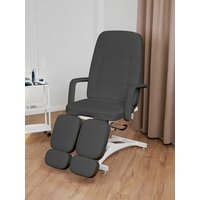 · Для того что бы обивка дольше сохраняла хороший внешний вид, его можно защитить специальным многоразовым чехлом для педикюрного кресла. Высокий уровень подъема ножной части позволяют мастеру комфортно наносить гель с мочевиной и др препараты для работы с пятками или осуществлять лечение грибка и подологический педикюр.
