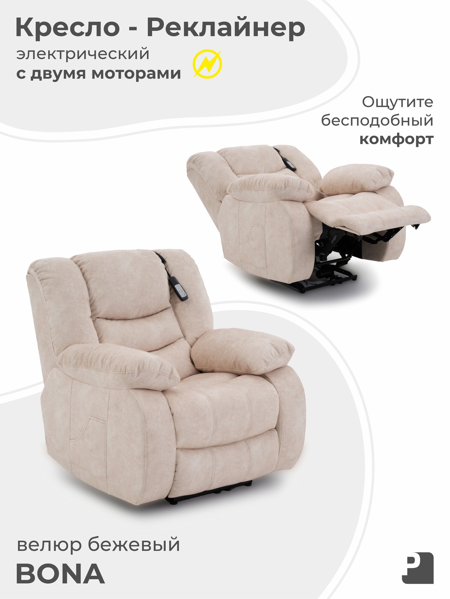 Кресло раскладное BONA, реклайнер электрический двухмоторный, велюр бежевый, Мебельное бюро PEREVALOV: сравнение цен, характеристики, фото, актуальное наличие и цены.