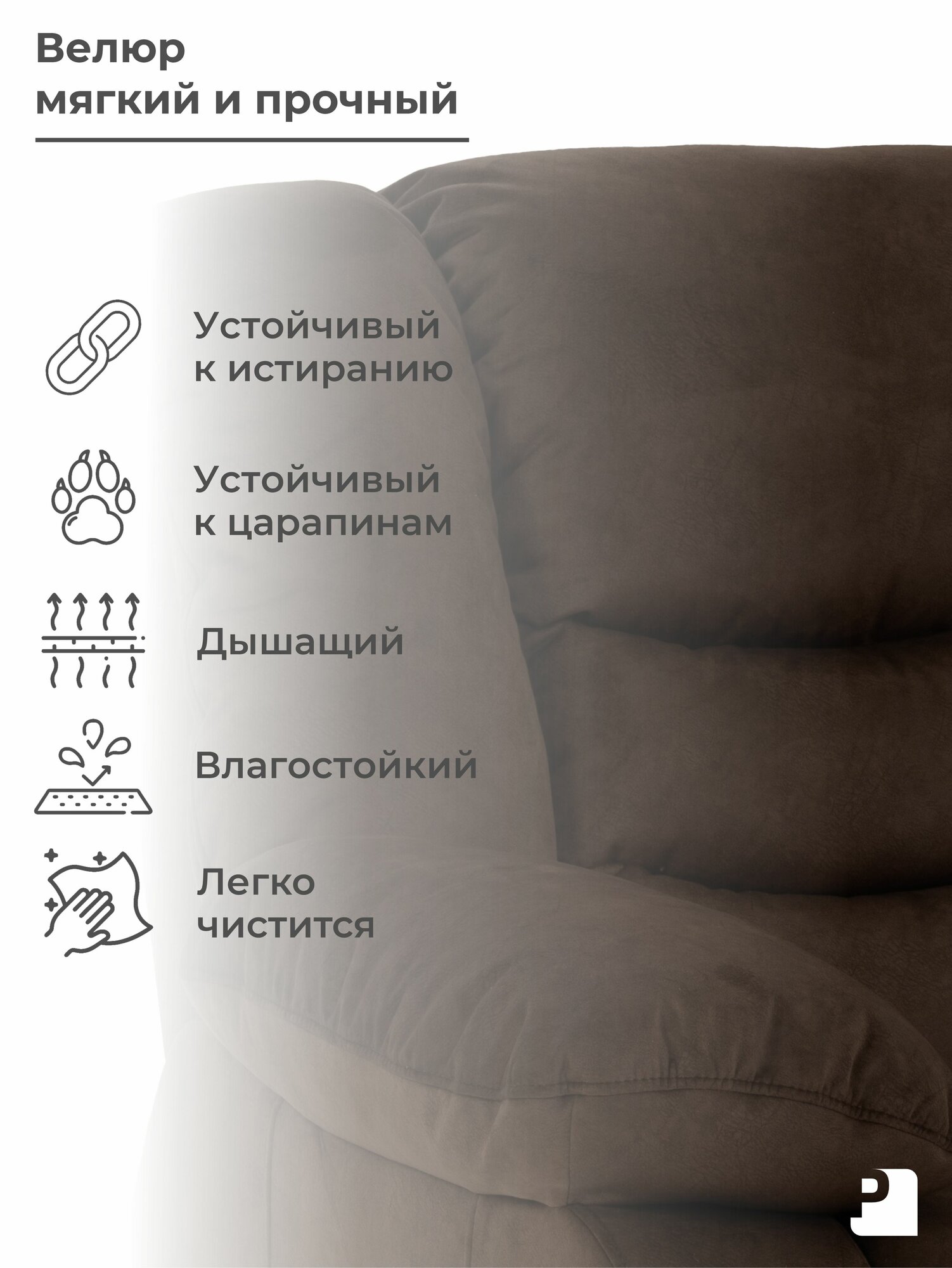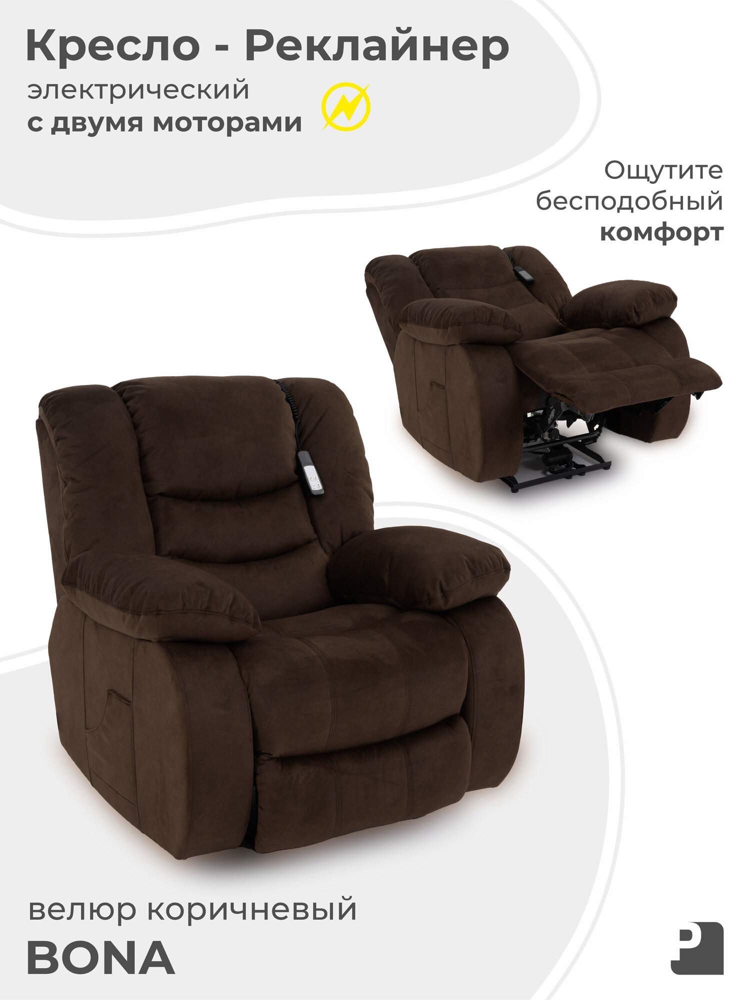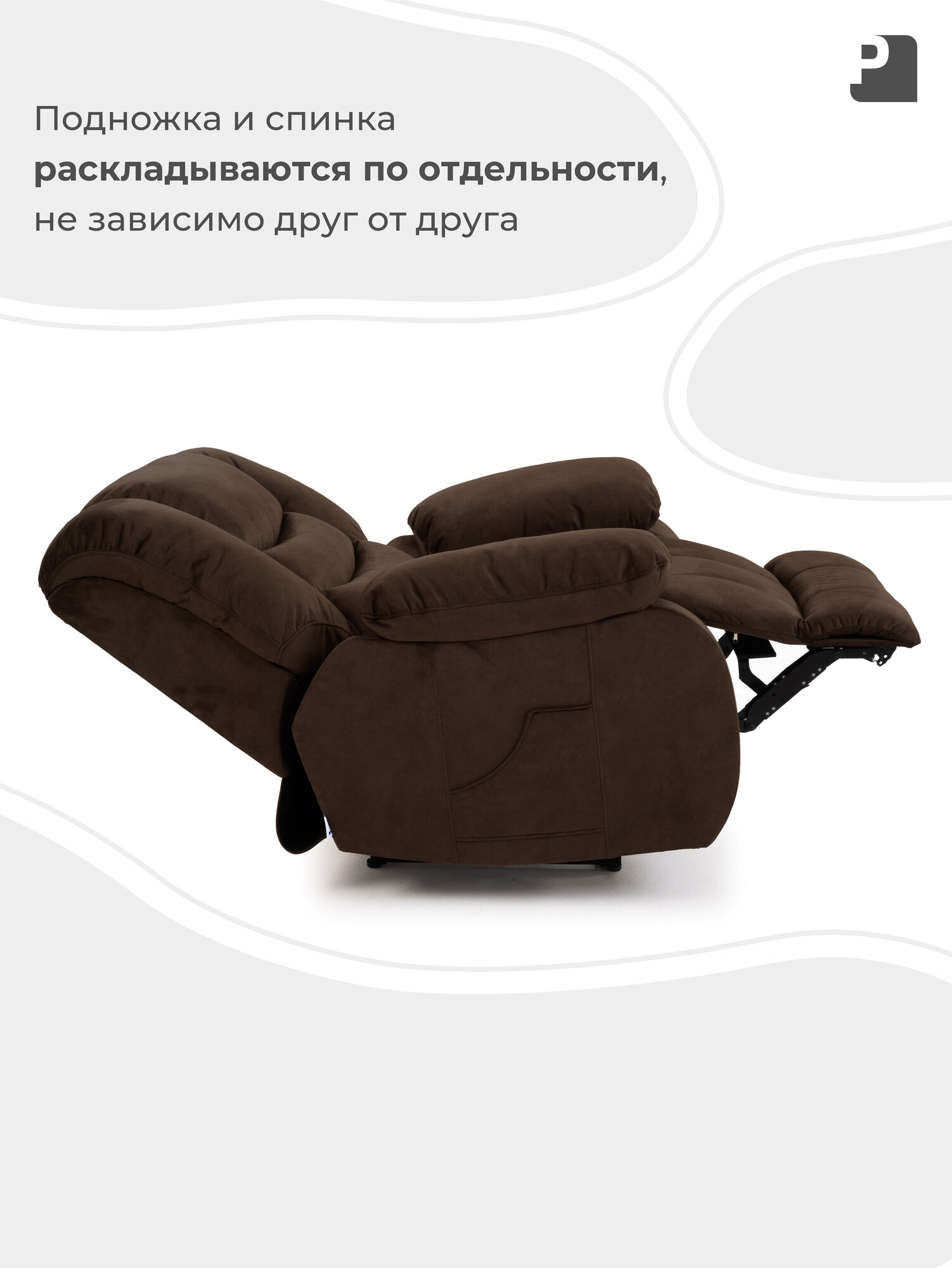 Одной из ключевых особенностей является электрический двухмоторный механизм, который позволяет регулировать наклон спинки и подножки не зависимо друг от друга. При помощи пульта запускается процесс плавного раскладывания кресла.