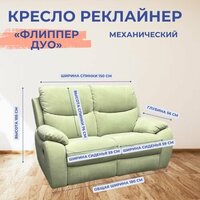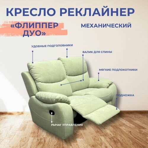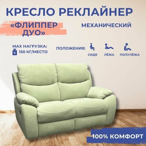 Двухместное кресло реклайнер «Флиппер Дуо» механическое, искусственный велюр «Тедди 029» — это удачное сочетание стиля и комфортабельности. Подойдет для ценителей комфорта и приятного времяпровождения. Оснащено широким сиденьем и удобными подлокотниками. Прекрасно подойдет как для гостиной, так и для рабочего кабинета. Дизайн кресла достаточно универсален, что позволяет ему вписаться как в современный, так и в классический интерьер.