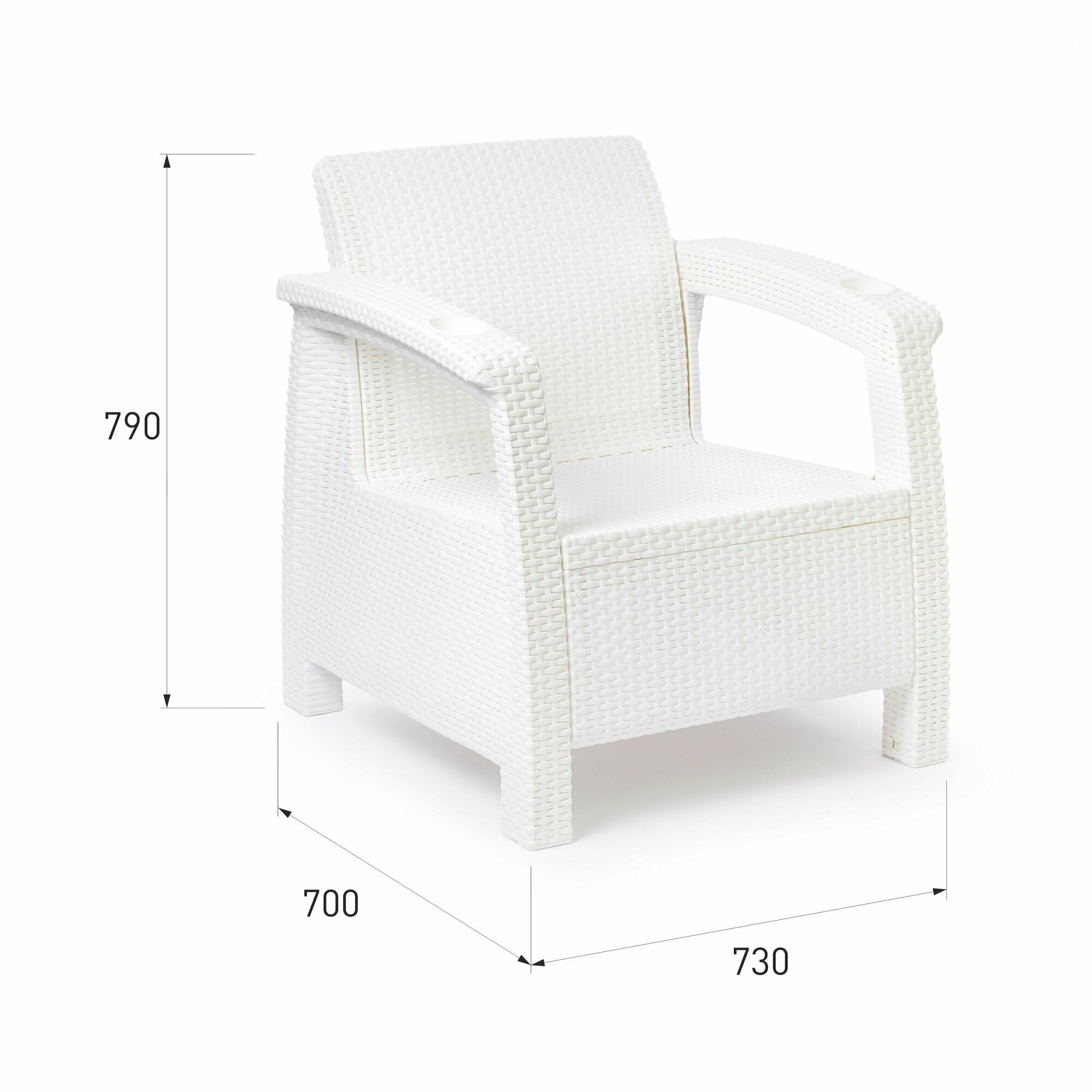 Кресло произведено из высококачественного полипропилена, имитирующего плетение из ротанга. Кресло имеет одно посадочное место, допустимая нагрузка на одно посадочное место - 106 кг . На подлокотниках дивана расположены отверстия для напитков. Кресло может стать идеальным решением по оформлению зоны отдыха в доме, на садовом участке, в офисном помещении или в кафе. Благодаря цветовым решениям, кресло подойдет под любой интерьер. Кресло упаковывается в индивидуальную упаковку, инструкция по сборке прилагается. Цвет - белый. Зону отдыха также можно дополнить журнальным столиком и диванами серии «Ротанг-плюс». Подушки для сидения входят в комплект. Для использования внутри и снаружи помещения.