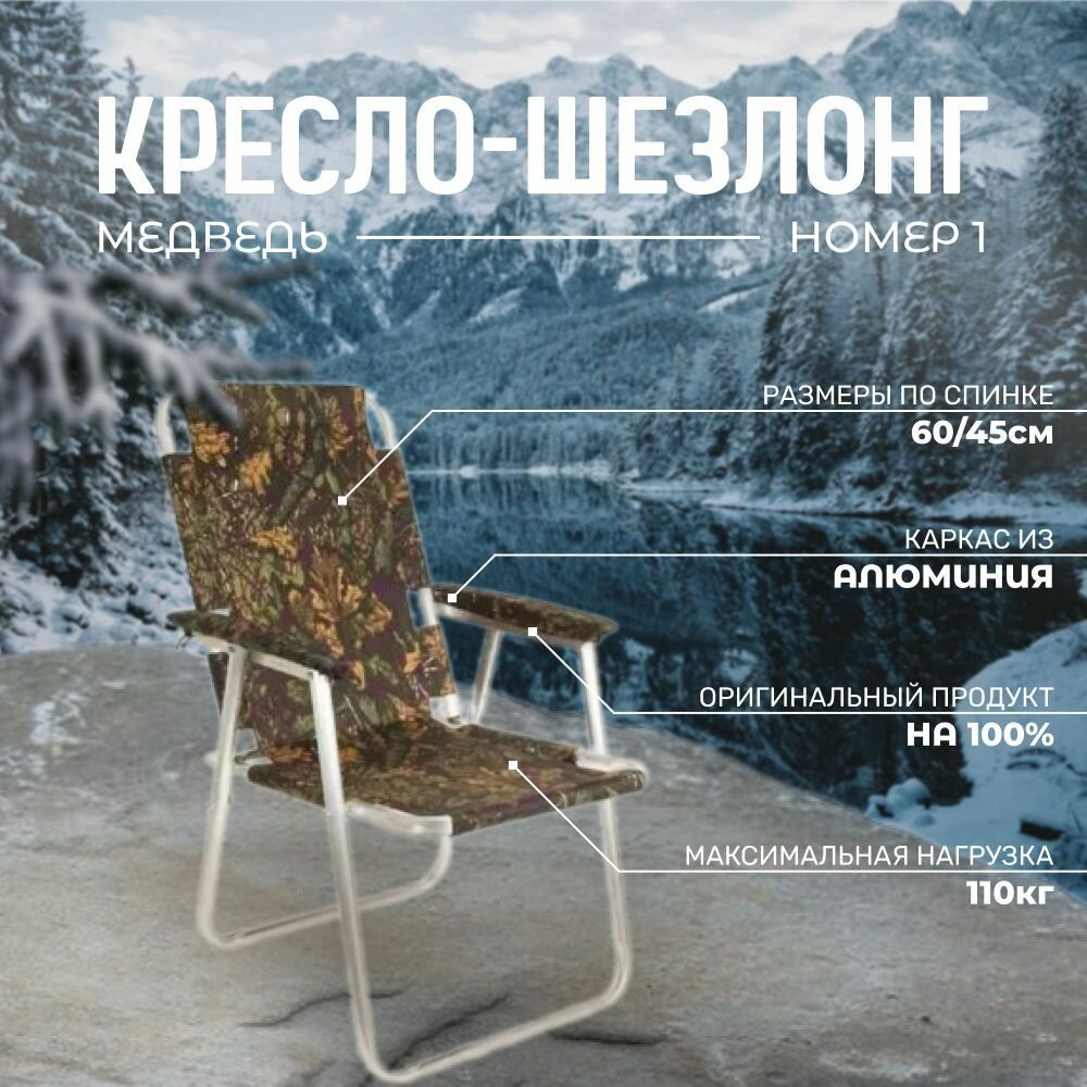 Представляем Вашему вниманию кресло-шезлонг №1 от российского производителя "Медведь". Это идеальное решение для отдыха на природе - складное кресло туристическое, которое легко поместится в багаже автомобиля, занимая минимум места. Кресло шезлонг имеет легкий алюминиевый каркас и изготовлено из прочной смесовой ткани Грета. Средняя высота спинки и большая высота сиденья обеспечат комфортное расположение тела. Размеры сиденья составляют 46 * 45 см, а высота сиденья от пола - 35 см. Высота спинки равна 60 см. Вес кресла всего 2,1 кг, но максимальная нагрузка составляет 120 кг. Размеры кресла в сложенном виде: 79 * 55 * 10 см. Каркас кресла изготовлен из алюминиевой трубы диаметром 25 мм, а смесовая ткань Грета обеспечивает долговечность и надежность. Цвет кресла может варьироваться от камуфляжа до осеннего леса. Обратите внимание, что рисунок и оттенок цвета могут отличаться от представленного на фото, поэтому перед покупкой уточняйте у продавца. Кресло-шезлонг №1 - это кресло раскладное, шезлонг складной, садовое кресло, которое станет незаменимым помощником для отдыха на природе.