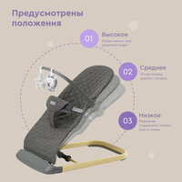 • Для детей от рождения и до двух лет (вес от 3,6 до 13 кг). • Эргономичное сидение обеспечивает надежную поддержку головы, шеи и спины ребенка. • Предусмотрено три положения. • Быстро и легко складывается для удобной транспортировки и хранения. Анатомический правильный покрой чехла равномерно распределяет вес ребенка во время нахождения в шезлонге. Этот фактор очень важен для маленьких детей, чьи мышцы еще не развиты. В дизайне изделия предусмотрен фиксатор для малыша, чтобы ребенок не выпал из шезлонга. Кресло – шезлонг BABYROX - комфортное место для длительного времяпрепровождения вашего малыша! Материал • Стеганый чехол обеспечивает удобство. Основание: дерево, пластик. • Весь используемый текстиль приятен для кожи малышей и безопасен для детских экспериментов – пробы ткани «на зуб». • Чехол легко снимается и стирается в машинке при температуре 40С. Достаточно ослабить две эластичные петли в нижней части изделия и снять чехол с каркаса. Не гладьте и не используйте кондиционер для белья, так как это ухудшит качество ткани.