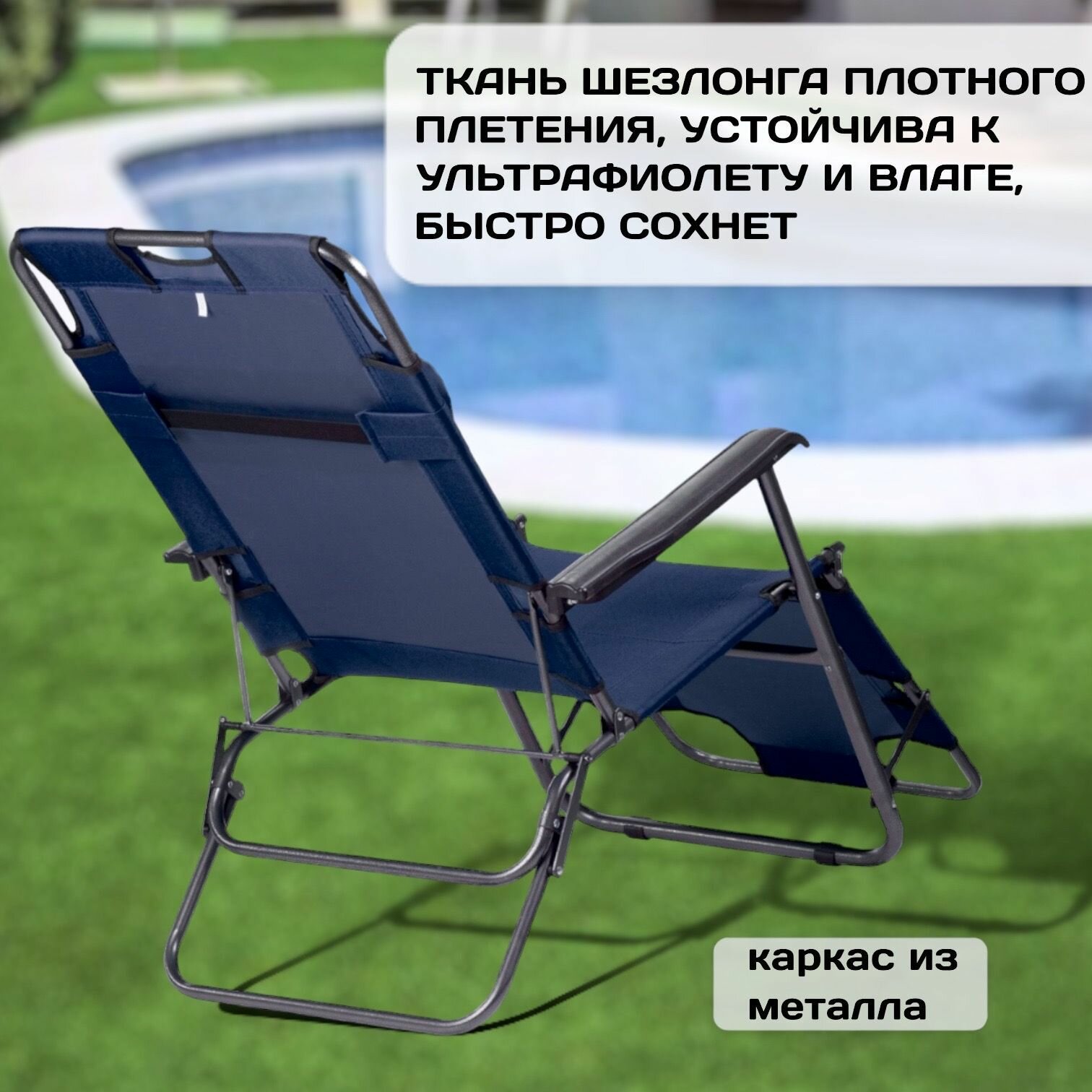 Шезлонг раскладной, два положения спинки, металлический каркас, тканевая обивка, устойчив к погодным условиям, подходит для отдыха на свежем воздухе.
